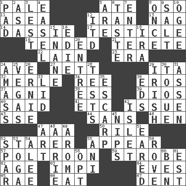 ACROSS 1. Light colored 5. Had dinner 8. Bear (Spanish) 11. Toward the sea 12. SW Asia republic 13. Tired old horse 14. Small ungulate mammals of Africa 17. One of the two male reproductive glands 19. Watched over 21. Cigar-shaped 22. (Had) reclined 23. Epoch 24. "___ Maria" 27. Remaining after all deductions 29. Call ___ day 32. Haggard of country music 34. To separate or throw off 36. Greek god of love 37. Hindu god of fire 38. Curvy letter 39. "Vaya con ____" 40. Expressed in words 41. And so on (abbr.) 42. Come out of 43. Compass dir. 44. Without 46. Layer 47. American Automobile Association (abbr.) 50. Cause heat under the collar 52. A viewer who gazes fixedly 55. Become visible 57. Characterized by complete cowardliness 59. Disco prop 62. Grow older 63. Body of Kaffir warriors 64. Nights before holidays 65. Actress Charlotte 66. Erode 67. Incision DOWN 1. Writing tablet 2. White ___ sheet 3. For fear that 4. Artist's stand 5. "We ___ not amused" (Victoria) 6. Clothes sense 7. Keyboard key 8. Single time 9. Table seasoning 10. Double curve, resembling the letter S 12. It would 15. Silly 16. Singer Brickell 18. Lyricist Gershwin 20. Main course 24. Collect or gather 25. Viva Las _ 26. Bert's buddy 28. Trials 29. From or relating to Ireland 30. Woman's close-fitting hat 31. NE Netherlands city 33. Hat (slang) 35. Fortification 36. Begley and Asner 42. Small island 45. Cuts off 47. Nonscientific branch of learning 48. Nest on high 49. Scent 51. Having ears or earlike features 52. Practice fight 53. Ancient Roman robe 54. Toward shelter 55. Black tropical American cuckoo 56. Be footloose 58. Choose 60. Benjamin's nick name 61. Eastern Standard Time (abbr.)