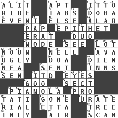 ACROSS 1. Came down and settled, as after flight 5. Fitting 8. "Tell ____ the Marines!" 12. Travel on or in a vehicle 13. Bar bills 15. Capital of the state of Qatar 16. Incident 18. Otherwise 19. Having or resembling wings 20. Infant food 22. Curse 24. Part of Q.E.F. 26. Superhero pair 27. Thickened enlargement 28. Observe 29. Car dealer's back yard 32. Part of speech 35. 1994 drama film starring Jodie Foster 37. Actress Gardner 38. Repulsive 39. ___ good deed 40. South Vietnam president (1954) 41. Teachers' org. 42. Posted 43. Taverns 44. Elected rep. 45. It would 46. Sight organs 49. Thick or sticky substance 50. Religious group 51. Player piano 55. Adept person 56. Jacques of French films 57. Went 59. A salt of uric acid 63. Monetary unit of Yemen 64. Singer James 65. Relationship diagram 66. In an inward manner 67. Atmosphere 68. Examine hastily DOWN 1. "We ___ not amused" (Victoria) 2. 54 in ancient Rome 3. Binary compound 4. 3-inch nail 5. Had dinner 6. Light colored 7. Cook's measure (abbr.) 8. Potato state 9. Lacquered or enameled metalware 10. Not this but _ 11. Rowing implement 14. Beer mug 17. Edible starchy tuberous root 21. Writing tablet 23. Third day of the wk. 25. Watched over 28. Chalkboards 29. (Had) reclined 30. Baking chamber 31. Scottish caps 32. Religious women 33. Double curve, resembling the letter S 34. Uhlan (variant) 36. A really long time 40. What propaganda does 42. Moe Howard, for one 45. Electrically charged atom 47. Slangy assent 48. Shade of tan 49. Lightheartedly 51. Ache 52. Slanted text style (abbr.) 53. Globular water bottle used in Asia 54. Against 56. Three (prefix) 58. Hearing organ 60. Curve 61. Afternoon social gathering 62. Car or cant ending