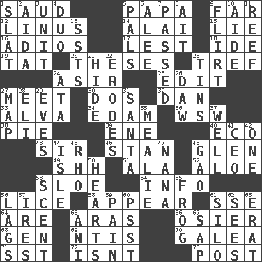 ACROSS 1. Saudi Arabian king (1953-1964) 5. Dad 9. At a great distance 12. "_ and Lucy" (Charlie Brown theme song) 14. Jai _ 15. Untruth 16. Goodbye (Sp.) 17. For fear that 18. Binary compound 19. Make lace 20. College papers 23. Unclean, religiously 24. SW Saudi Arabia district 25. Prepare for publication 27. Confront 30. Two (Sp.) 32. Daniel's nick name 33. Inventor's middle name 34. Dutch treat 36. Compass dir. 38. Sliced dessert 39. Compass dir. 40. Environmental prefix 43. Title for a knight 46. Comedian Laurel of Laurel & Hardy 48. Small, secluded valley 49. Quiet! 51. Wing 52. _ vera 53. _ gin 54. Information 56. Louse (plural) 58. Become visible 61. Compass dir. 64. "We ___ not amused" (Victoria) 65. Caspian sea tributary 66. Flexible twig of a willow tree 68. Commissioned mil. rank 69. Nuclear Threat Initiatives 70. An organ shaped like a helmet 71. Fast jet (abbr.) 72. Is not 73. Mail DOWN 1. Narrow board 2. Opera by Verdi 3. A single undivided whole 4. Superhero pair 5. Friends 6. Toward shelter 7. Went by 8. Small island 9. Talk or behave amorously 10. Helper 11. Coral collection 13. Fast planes 21. Flintstone garb 22. Eats (away) 23. Canisters 24. _ moment's notice (2 wds.) 26. Obsolete 27. Atlas unit 28. Biblical high priest 29. Nights before holidays 31. Before Barbara or Clara 35. Ear of corn 37. Water source 41. Corporate head (abbr.) 42. Single 44. Small island 45. 17th letter of the Greek alphabet 47. Nanny 48. E Mali city 50. Centers 53. Aroma 55. Tree-dwelling hopper 56. Fails to keep up a pace 57. Angers 59. Ache 60. Inconspicuous attention getter 61. Grain storage tower 62. Observes 63. Part of Q.E.F. 65. Cuckoo 67. Plant excrement