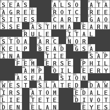 ACROSS 1. Oceans 5. In addition 9. "One Day ___ Time" 12. Match 14. College mil. group 15. To riddle 16. Locates 17. Heavy open wagon 18. E Mali city 19. Compass dir. 20. Respiratory problem 23. Merit 24. General guideline 25. Slanted text style (abbr.) 27. Portico 30. Curve 32. Or not 33. Seaweed 34. Necklace unit 36. Girls' org. (abbr.) 38. _ tizzy (2 wds.) 39. Neckwear 40. Plant excrement 43. Opposite of masc. 46. Celtic language 48. Silvers or Donahue 49. Electrical Unit 51. Petroleum 52. Suggestive of the supernatural 53. At sea 54. The Jewish people; Israel 56. 270 degrees 58. Scheduled 61. Fool 64. Big collection agency 65. Smallest unit of an element 66. Peak District village in England 68. Whopper 69. Wig 70. A piece of turf (Scot.) 71. Lair 72. Enthusiasm 73. Snake ____ (dice throw) DOWN 1. Backtalk 2. Armor plate that protects the chest 3. Johnson of "Laugh-In" 4. Perceive with the eye 5. Bowlike part 6. Rich soil 7. Put through a sieve 8. Sep. follower 9. Therefore, facetiously 10. Separate forcefully 11. Period of immesurable duration 13. He sold his birthright 21. Broad, flat, thick piece 22. Cylindrical with tapered ends 23. Hearing organs 24. Strike 26. Coat; cloak 27. What Jean-Claude Killy likes to do 28. Nine, plus one 29. Norwegian king 31. Capital of Egypt 35. Stop 37. American tennis player Robert 41. Wind 42. Apply oneself diligently 44. 90 degrees 45. Madame (abbr.) 47. Writer Wiesel 48. Writing instrument 50. Soft color 53. NE Netherlands city 55. Wrote a lyric poem 56. Rampant 57. 4th largest of the Great Lakes 59. Globular water bottle used in Asia 60. So be it 61. _ Jones' Locker 62. Medicinal plant 63. Soaks 65. Had dinner 67. Expire