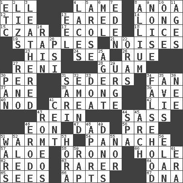 ACROSS 1. Pipe bend 4. Unable to walk 8. Small Philippine buffalo 12. Neckwear 13. Having ears or earlike features 14. Yearn 15. Russian ruler of old 17. Learning spot: Fr. 18. Louse (plural) 19. Paper fasteners 21. Annoying sounds 23. Part of HMS, perhaps 24. Ocean 26. Sorrow 27. Painter Guido (1575-1642) 28. Island territory of the United States 30. For each 31. Spring feasts 34. Air blower 37. One (Scot) 38. Amid 39. "___ Maria" 40. Dreamland 41. Make 42. Whopper 43. It's straight from the horse's mouth 44. Backtalk 46. Age 47. June honoree 50. Before (prefix) 51. Heat 54. Flamboyance 57. Medicinal plant 58. U. of Maine site 60. Hollow 62. Redecorate 63. Less widely known 64. Rowing implement 65. Observes 66. Flats, for short 67. Heredity factor (abbr.) DOWN 1. And so on (abbr.) 2. Belonging to Elizabeth 3. Resembling or made to resemble leather 4. Shoestrings 5. Came up 6. Cartoonist voice _ Blanc 7. Genesis locale 8. Plant genus of onion and garlic 9. Annoying sound 10. At one time in the past 11. Ripens 13. Snakelike fish 16. Water falling in drops from the sky 20. 23rd letter of the Greek alphabet 22. Mouths or openings 25. Representative 27. Former U.S. Attorney General Janet 29. Goad 30. Baking dish 31. Indian skirt 32. Make improvements or corrections to 33. ___ good deed 34. It jiggles the polygraph 35. Opinion 36. Born 41. Penny 43. Lover boys 44. Health resort 45. Bowlike part 46. Wear away 48. To the left, to Queeg 49. Natives or inhabitants of Denmark 51. Armed conflicts 52. Toward shelter 53. Israeli folk dance 55. And not 56. Liveliness 59. Strike 61. Epoch