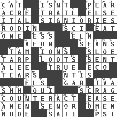 ACROSS 1. Domesticated feline 4. Is not 8. Lightbulb-shaped fruit 12. 1/640 square mile 14. Go after with the intent to catch 16. Otherwise 17. Slanted text style (abbr.) 18. Seigniories (variant) 20. "The Thinker" sculptor 22. _-fi 23. Ingest 24. Single 25. Double-curved letter 28. Shade tree 30. Period of immesurable duration 31. Actors Connery and Penn 35. Scottish cap 37. Charged atoms 40. _ gin 41. Canvas cover 42. Plunders 44. Posted 45. Toward shelter 46. Loyal 47. Environmental prefix 48. Lacerates 50. Nuclear Threat Initiatives 52. Raised railways 54. Slender fish 55. Federal power corp. 58. Quiet! 61. Fr. "Yes" 63. Lean end of the neck 65. Act in opposition 70. Relaxation 71. So be it 72. Sir (Sp.) 73. Presage 74. Thickened enlargement 75. Suttee (variant) 76. Pacific Standard Time (abbr.) DOWN 1. Capital of Egypt 2. NE Massachussets city 3. Buy and sell 4. ___ a Wonderful Life 5. _ Lanka 6. Tired old horse 7. Airtight sealed metal containers 8. For each 9. Writer Wiesel 10. Toward the sea 11. Relief 13. Connecticut Ivy Leaguer 15. Louse (plural) 19. Petroleums 21. Born 26. Earth 27. Snob 29. Makes clutter 30. Electrical Unit 32. Actor Baldwin 33. Words to Nanette 34. Arrange properly for use 35. Falsehood 36. Length times width 38. Or not 39. Feeling sharp psychological pain 41. Make lace 43. Stalk of a moss capsule 49. Groove 51. Big collection agency 53. Institutes legal proceedings 55. _____ steamer (cargo ship) 56. Flower holders 57. Representative 58. Examine hastily 59. Same (prefix) 60. Took on color 62. Angers 64. Corporate head (abbr.) 66. Compass dir. 67. Santa ___, CA 68. Small bed 69. Three (prefix)