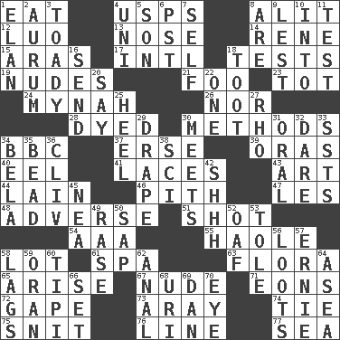 ACROSS 1. Ingest 4. United States Postal Service (abbr.) 8. Came down and settled, as after flight 12. Nilotic language 13. Olfactory organ 14. French philosopher Descartes 15. Ancient river in northeast Turkey 17. International (abbr.) 18. Trials 19. Unclothed pictures 21. Egg _ yung 23. Small child 24. Non-adult bird? 26. Not either 28. Colored 30. Modes 34. English channel? 37. Celtic language 39. Mouths or openings 40. Snakelike fish 41. Shoestrings 43. Nonscientific branch of learning 44. (Had) reclined 46. Heart or essence 47. French article 48. Contrary to your interests or welfare 51. Opportunity 54. Auto club (abbr.) 55. White Person, in Hawaii 58. Car dealer's back yard 61. Health resort 63. Plants 65. Ascend 67. Unadorned 71. Immeasurably long periods of time 72. Open wide 73. Like ___ of sunshine 74. Standoff 75. In a ____ (agitated or irritated) 76. Actor's bit 77. Ocean DOWN 1. Flair 2. Gold (Symbol: Au) 3. Sycophant 4. Corn or form start 5. Male offspring 6. Pacific Standard Time (abbr.) 7. Automatic 8. "We ___ not amused" (Victoria) 9. For fear that 10. To the inside or interior of 11. Trial 16. Post 18. A blast of a horn 20. Declare 22. Single 25. Person who is morally reprehensible 27. 17th letter of the Greek alphabet 29. Window treatment 30. Confronts 31. Taken by mouth 32. Have the gumption 33. Fast planes 34. Actor Lugosi 35. Necklace unit 36. 154 in Roman numerals 38. _-fi 42. Quiet! 45. Teachers' org. 49. To erase 50. Plant excrement 52. Clumsy lout 53. Lacquered or enameled metalware 56. Plunders 57. Bert's buddy 58. Straggles 59. Northwest Algerian city 60. Native american tent (variation) 62. Of or related to the anus 64. Toward the sea 66. Arrange properly for use 68. RI univ. 69. One of the 12 tribes of Israel 70. Sight organ