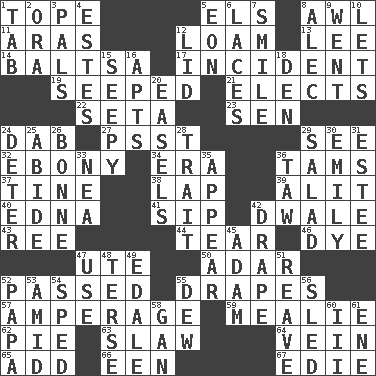 ACROSS 1. Drink excessively 5. Raised railways 8. Leather borer 11. Ancient river in northeast Turkey 12. Rich soil 13. Area sheltered from the wind 14. Greek mezzo-soprano Agnes 17. Event 19. Oozed 21. Opts 22. Stalk of a moss capsule 23. Elected rep. 24. Pat or tap gently 27. Inconspicuous attention getter 29. Observe 32. Black 34. Epoch 36. Scottish caps 37. Prong on a fork 38. Pet locale 39. Came down and settled, as after flight 40. Pulitzer Prize-winning author Ferber 41. Small drink 42. A sleeping potion; an opiate (poet.) 43. To separate or throw off 44. Rend 46. Color 47. Shoshoni 50. The sixth month of the Jewish calendar 52. Went by 55. Window treatments 57. Electrical Measurement 59. Ear of corn 62. Sliced dessert 63. Cole _ (cabbage dish) 64. Distinctive style or manner 65. Increase 66. Car or cant ending 67. Singer Brickell DOWN 1. Bar bill 2. Mouth or opening 3. Friends 4. _____ Park, CO 5. Period of immesurable duration 6. Shoestrings 7. Grin 8. Actor Baldwin 9. Left 10. Allows 12. Hat (slang) 15. Oozy 16. Tenement units (abbr.) 18. Lair 20. Artist's stands 24. Prevent from occurring 25. Tolerate 26. Child's nurse 28. Distinguishing feature 29. First course 30. Poet Dickinson 31. First name in cosmetics 33. Teachers' org. 35. Seem 36. The 23rd letter of the Hebrew alphabet 42. Window treatment 45. First of billions? 47. Purpose 48. Laconic 49. Peak District village in England 51. Break or tear apart 52. Dad 53. Among 54. Hurried 55. Morning condensation 56. Downhill vehicle 58. Separate the seeds from cotton 60. One more than two 61. Compass dir.