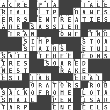 ACROSS 1. 1/640 square mile 5. Parent Teacher Association (abbr.) 8. Lie 12. Monetary unit of Yemen 13. Mouth edge 14. Natives or inhabitants of Denmark 15. Blunders 16. Pleas 19. "We ___ not amused" (Victoria) 20. More disrespectful 21. SW Asia republic 23. Single 24. Working for oneself (abbr.) 27. Simple or foolish person 30. Portico 31. Flight of steps 34. Needle case 35. Suttee (variant) 38. Giggle 40. Immeasurably long periods of time 41. Angers 42. Flew 44. Egg locale 45. Libertine 46. Eastern Standard Time (abbr.) 47. Keyboard key 50. Part of Q.E.F. 53. Speakers 57. Director Reiner 59. Italian handbag shop? 63. Globular water bottle used in Asia 64. Slow-paced one 65. Fenced enclosure 66. Austrian river, tributary to the Danube 67. Canvas cover 68. Compass dir. 69. Snakelike fish DOWN 1. Type of rug 2. High-altitude cloud 3. Less widely known 4. Raised railways 5. Entreaty 6. Airtight sealed metal containers 7. Tenement units (abbr.) 8. Make lace 9. Black tropical American cuckoo 10. Area sheltered from the wind 11. Curvy letter 14. Have the gumption 17. _ de Janeiro 18. Car or cant ending 20. In a ____ (agitated or irritated) 22. Help 24. "Tell ____ the Marines!" 25. Part of speech 26. Raised platform 28. Floor covering 29. Sliced desserts 30. Sowing specialist 32. 17th letter of the Greek alphabet 33. Dry up 35. Trig term 36. Ancient Greek god of war 37. Trial 39. Epoch 43. Supplements with great effort 47. Implement 48. Sandy's bark 49. Soap unit 51. Came up 52. "_____ Recall" 54. Drink excessively 55. Sign of things to come 56. French philosopher Descartes 58. Soap units 59. Fast jet (abbr.) 60. Santa ___, CA 61. Auto 62. Monetary unit of Laos 63. Whopper