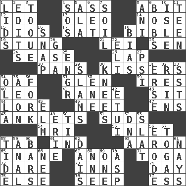 ACROSS 1. Allow 4. Backtalk 8. "This won't hurt ____!" 12. Wedding promise 13. Margarine 14. Characteristic smell of wine 15. "Vaya con ____" 17. Suttee (variant) 18. Instruction Manual for Humans 19. Feeling sharp psychological pain 21. Luau accessory 23. Elected rep. 24. Gospel singer Marvin 26. Pet locale 28. Zero-star reviews 30. Smoochers 34. Clumsy lout 37. Small, secluded valley 39. Angers 40. Lion 41. Indian princess (variant) 43. Be seated 44. Old wives' tales, e.g. 46. Rendezvous 47. Followers of ems 48. Short socks 51. Beer foam 54. Medical imaging device (abbr.) 55. An arm off of a larger body of water 58. Keyboard key 61. Working for oneself (abbr.) 63. Composer Copland 65. Silly 67. Small Philippine buffalo 71. Ancient Roman robe 72. Have the gumption 73. Restaurants 74. 24 hours 75. Otherwise 76. Ooze 77. Double-curved letter DOWN 1. Flaplike coverings 2. Prepares for publication 3. Woman's close-fitting hat 4. Mayday 5. According to 6. Put into a specified state 7. The visible part of the earth's surface 8. Cuckoo 9. Moves up and down 10. Small island 11. Adolescent 16. Fastener 18. Prejudice 20. Girls' org. (abbr.) 22. Biblical high priest 25. Engineer (abbr.) 27. Air pressure measure (abbr.) 29. Criticizes harshly 30. Leg joints 31. Celtic language 32. It's straight from the horse's mouth 33. Fast planes 34. Rounded earthenware pot or jar 35. A really long time 36. Tined utensil 38. Compass dir. 42. Needle case 45. Shade tree 49. 4th largest of the Great Lakes 50. Shallow baking pan 52. Heredity factor (abbr.) 53. Narrow board 56. Wear away 57. Ancient Roman robes 58. Periodic rise and fall of the sea level 59. Of or related to the anus 60. Long, evenly shaped pieces 62. Raised platform 64. Negative votes 66. Born 68. Compass dir. 69. Single 70. Viper