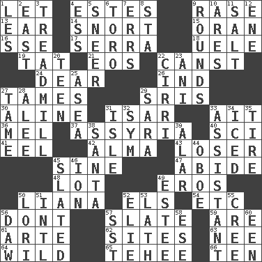 ACROSS 1. Allow 4. _____ Park, CO 9. Raze (variant) 13. Ewer handle 14. Derisive sound 15. Northwest Algerian city 16. Compass dir. 17. Spanish missionary in California 18. Ubangi River tributary 19. Make lace 21. Greek goddess of the dawn 22. 2nd pers. sing. pres. of can (arch.) 24. Letter starter 26. Working for oneself (abbr.) 27. Softens 29. Indian titles of respect 30. Place in a line 31. Austrian river, tributary to the Danube 33. Small island 36. Cartoonist voice _ Blanc 37. Nineveh was its capital 40. _-fi 41. Snakelike fish 42. _ mater 43. Failure 45. Trig term 47. Stay 48. Car dealer's back yard 49. Greek god of love 50. Climbing, woody, usually tropical vines 52. Raised railways 54. And so on (abbr.) 56. Do not 57. Chalkboard 59. "We ___ not amused" (Victoria) 61. Johnson of "Laugh-In" 62. Settings 63. Born 64. Uncontrolled 65. Giggle 66. "___ Little Indians" DOWN 1. French article 2. Compass direction 3. Excercise machine 4. Double-curved letter 5. Contemptuous expression 6. "Corrida" creature 7. Blunders 8. R.R. building 9. Periods in a boxing match 10. Ancient Greek god of war 11. Table seasoning 12. Compass dir. 20. Adolescent 22. High-altitude cloud 23. Cuckoo 25. Toward the sea 27. Docile 28. Toward shelter 29. "Two Mules for Sister ____" 31. Small island 32. Symbol (abbr.) 33. Aide 34. On the rocks 35. Hoop that covers a wheel 38. Before Barbara or Clara 39. Having or resembling wings 44. Mitch Miller's instrument 45. Scheduled 46. Electrically charged atom 49. First name in cosmetics 50. Australian parrot (variant) 51. International (abbr.) 52. Writer Wiesel 53. Thin strip of wood or metal 55. Algonquian 56. Simpleton 57. Fast jet (abbr.) 58. Compass dir. 60. Car or cant ending