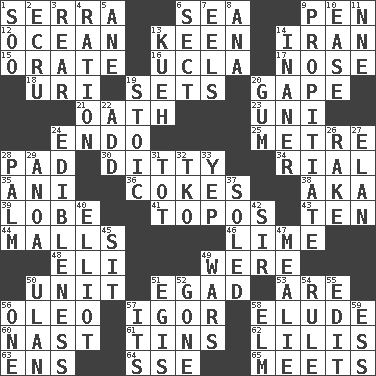 ACROSS 1. Father Junipero _ 6. Ocean 9. Animal enclosure 12. Sea 13. Peachy ____! 14. SW Asia republic 15. Speak pompously 16. Southern CA. univ. 17. Sense of smell 18. RI univ. 19. Arranges properly for use 20. Open wide 21. Pledge 23. Single; one (prefix) 24. Inside; within (prefix) 25. Distance measurement (Brit.) 28. Groovy apt. 30. Short, simple song 34. Monetary unit of Yemen 35. Black tropical American cuckoo 36. Popular sodas 38. Alias (abbr.) 39. Ear part 41. Traditional theme or motif 43. "___ Little Indians" 44. Promenades 46. Welles in "The Third Man" 48. Connecticut Ivy Leaguer 49. Past tense of be (plural) 50. A single undivided whole 51. Mild oath 53. "We ___ not amused" (Victoria) 56. Margarine 57. Russian composer Stravinsky 58. Dodge 60. Political cartoonist Thomas 61. Canisters 62. Ms. Damita and namesakes 63. Followers of ems 64. Compass dir. 65. Confronts DOWN 1. "Barney Miller" actor Jack 2. Shade of tan 3. Located in or toward the back 4. Food allowance for one day 5. A saturated hydrocarbon 6. Religious group 7. Snakelike fish 8. Santa ___, CA 9. Conciliate 10. Comfort 11. Compass dir. 13. Malaysian steamed pastry 14. More lacking in sense or substance 19. Unemotional 20. Chewing product 22. Increase 24. The property of being fit to eat 26. Immoral or dissolute person 27. Style 28. Inside of hand 29. Small Philippine buffalo 31. Small child 32. Ring climax 33. Slangy assent 37. Having a sole or soles 40. American author Paul (1891-1958) 42. Title for a knight 45. Be seated 47. Ear of corn 49. Armed conflicts 50. ____ Bator, Mongolia 51. The front part of a cuirass 52. Went 54. Governing power 55. Prepare for publication 56. Single 57. ___ a Wonderful Life 58. Shade tree 59. Double-curved letter