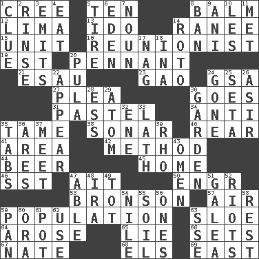 ACROSS 1. Algonquian 5. "___ Little Indians" 8. Lip ointment 12. Pale green bean 13. Wedding promise 14. The wife of a rajah (variant) 15. A single undivided whole 16. One who advocates reunion 19. Eastern Standard Time (abbr.) 20. Pre-World Series prize 21. He sold his birthright 23. E Mali city 24. Girls' org. (abbr.) 27. Entreaty 30. Travels 31. Soft color 34. Against 35. Docile 38. Underwater navigation system 40. Posterior 41. Type of rug 42. Mode 44. Fermented drink made from hops 45. Residence 46. Fast jet (abbr.) 47. Small island 50. Engineer (abbr.) 53. "Death Wish" actor 57. Wind 59. Census information 63. A type of plum 64. Came up 65. Falsehood 66. Arranges properly for use 67. Nathan's nickname 68. Raised railways 69. 90 degrees DOWN 1. A slight indication 2. Wash lightly 3. Sends forth 4. Consume 5. Hoop that covers a wheel 6. Paradise 7. Part of speech 8. Forbid 9. Black tropical American cuckoo 10. French article 11. Was introduced to 14. Printing process, for short 17. Tired old horse 18. _ tizzy (2 wds.) 20. Monetary unit of Botswana 22. Seem 24. Went 25. Stalk of a moss capsule 26. SW Saudi Arabia district 28. Double-curved letter 29. Tiny particle 30. Place where plants grow 32. Compass dir. 33. Thin strip of wood or metal 35. Bar bills 36. Ancient Greek god of war 37. Confront 39. 17th letter of the Greek alphabet 43. Presage 47. Competent 48. Retirement account (abbr.) 49. Small child 51. An organ shaped like a helmet 52. Debaucheries 54. "Death on the ____" 55. Land 56. Singles 58. Respite 59. Baking dish 60. Mouth or opening 61. Cooking vessel 62. Purpose 63. Compass dir.