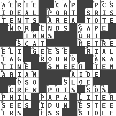 ACROSS 1. Nest on high 6. Head covering 9. Personal Computers (abbr.) 12. Perfect 13. Sweet dark-red dessert wine 14. Indian titles of respect 15. Portable shelters 16. Type of rug 17. Carryall 18. Not either 19. Conclusions 20. Yawn 21. Taverns 23. RI univ. 24. Scram! 25. Distance measurement (Brit.) 28. Biblical high priest 30. Honkers 34. Monetary unit of Yemen 35. Label 36. Unit of ammunition 38. Alias (abbr.) 39. Prong on a fork 41. Scornful expression 43. "___ Little Indians" 44. Believer in; advocate of (suffix) 46. Assistant 48. Bear (Spanish) 49. _ gin 50. Group working together 51. Plant holders 53. Distress signal 56. Silvers or Donahue 57. Dad 58. 61 cubic inches 60. Perceives with the eye 61. Goddess of spring and wife of Bragi 62. First name in cosmetics 63. Big collection agency 64. Curvy letter 65. Took without asking DOWN 1. Small island 2. Genesis locale 3. Western Nevada city 4. Of or pertaining to medicine 5. Raised railways 6. Drawstring 7. Ancient Greek god of war 8. Parent Teacher Association (abbr.) 9. Conciliate 10. Quote 11. Compass dir. 13. Zero-star reviews 14. A viewer who gazes fixedly 19. Keyboard key 20. Chewing product 22. Tired old horse 24. Seigniories (variant) 26. Immoral or dissolute person 27. Enthusiasm 28. Singer James 29. Den 31. Greek goddess of the dawn 32. Player for Phoenix 33. Compass dir. 37. Allots cards 40. Artist's stands 42. River (Sp.) 45. Immediately 47. Stop 49. Comedian Laurel of Laurel & Hardy 50. "Mermaids" star 51. Groovy apts. 52. Musical composition 54. Von Bismarck 55. Sew up the eyelids of hawks and falcons 56. Air pressure measure (abbr.) 57. Sliced dessert 58. French article 59. To riddle