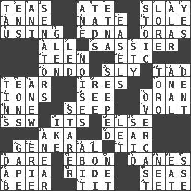 ACROSS 1. Afternoon social gatherings 5. Had dinner 8. Kill 12. Queen of England 1702-14 13. Nathan's nickname 15. Lacquered or enameled metalware 16. Exploiting 18. Pulitzer Prize-winning author Ferber 19. Mouths or openings 20. Everything 22. More disrespectful 24. Adolescent 26. And so on (abbr.) 27. Southwest Nigerian state 28. Wily 29. Bit 32. Pull into pieces 35. Angers 37. Single 38. Charged particles 39. Perceive with the eye 40. NW Algerian seaport 41. Compass dir. 42. Ooze 43. Electrical Unit 44. Compass dir. 45. ___ a Wonderful Life 46. Otherwise 49. Alias (abbr.) 50. Letter starter 51. Commissioned military rank 55. Nervous spasm 56. Have the gumption 57. Inky black, to poets 59. Natives or inhabitants of Denmark 63. Capital of Western Samoa 64. Travel on or in a vehicle 65. Oceans 66. Fermented drink made from hops 67. Teat (slang) 68. False hair DOWN 1. The 19th letter of the Greek alphabet 2. Followers of ems 3. Black tropical American cuckoo 4. Elected representatives 5. One (Scot) 6. Small amounts or degrees 7. Inactive volcano in Sicily 8. Unemotional 9. Old wives' tales, e.g. 10. Having or resembling wings 11. Consenting reply 14. Artist's stands 17. Small, secluded valley 21. Directed 23. Filthy place 25. Annoying sounds 28. Oozed 29. "Corrida" creature 30. Of or related to the anus 31. Scratch 32. Airtight sealed metal containers 33. Immeasurably long periods of time 34. Afresh 36. To separate or throw off 40. Cloudy 42. A viewer who gazes fixedly 45. Mamie's husband 47. Allow 48. Stated 49. Approach 51. Yawn 52. One of the Great Lakes 53. "This won't hurt ____!" 54. Farming town in central California 56. Pat or tap gently 58. Fish or hair follower 60. Born 61. Ingest 62. Compass dir.