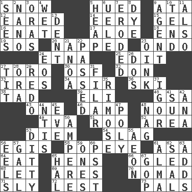 ACROSS 1. Frozen precipitation 5. Took on color 9. "One Day ___ Time" 12. Having ears or earlike features 14. Suggestive of the supernatural 15. Set 16. Maternal 17. Medicinal plant 18. Followers of ems 19. Distress signal 20. Slept 23. Southwest Nigerian state 24. Inactive volcano in Sicily 25. Prepare for publication 27. "Corrida" creature 30. Order of Saint Francis (abbr.) 32. Spanish title 33. Angers 34. SW Saudi Arabia district 36. What Jean-Claude Killy likes to do 38. Bit 39. Connecticut Ivy Leaguer 40. Girls' org. (abbr.) 43. Single 46. Moist 48. Part of speech 49. Federal power corp. 51. Friend of Pooh 52. Type of rug 53. South Vietnam president (1954) 54. Volcanic refuse 56. The front part of a cuirass 58. Wimpy's pal 61. White ___ sheet 64. Consume 65. Coop moms 66. Stared 68. Allow 69. Ancient Greek god of war 70. Roamer 71. Roguish 72. For fear that 73. Friends DOWN 1. Perceives with the eye 2. Billionth: prefix 3. Mouths or openings 4. Soggy 5. Pile 6. Ubangi River tributary 7. Eaten away 8. Color 9. Rep 10. Be inclined (to) 11. In addition 13. Incision 21. Small Philippine buffalo 22. Went by 23. Pig sound 24. Greek goddess of the dawn 26. Two (Sp.) 27. Teat (slang) 28. Mouth or opening 29. Make new 31. Having threads 35. Full of chinks, cracks, or crevices 37. Composer Stravinsky 41. Take to court 42. Santa ___, CA 44. Nuclear Threat Initiatives 45. First lady 47. More than one (prefix) 48. Tired old horse 50. Electrical Unit 53. Simple song 55. Age 56. Snakelike fish 57. Highlander 59. Washington bills 60. Inconspicuous attention getter 61. _ mater 62. Lick closed 63. Does sums 65. Actor Linden 67. Republican Party