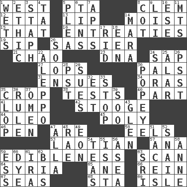 ACROSS 1. Compass direction 5. Parent Teacher Association (abbr.) 8. To starve (Brit.) 12. Singer James 13. Mouth edge 14. Damp 15. Not this but _ 16. Pleas 19. Small drink 20. More impudent 21. US Secretary of Labor Elaine L. _ 23. Heredity factor (abbr.) 24. Plant excrement 27. Chops off 30. Friends 31. Takes place subsequently 34. Mouths or openings 35. Riding implement 38. Trials 40. Piece 41. Mass 42. Moe Howard, for one 44. Margarine 45. Much (prefix) 46. Writing instrument 47. "We ___ not amused" (Victoria) 50. Snakelike fish 53. Of or relating to Laos or its people 57. Santa ___, CA 59. The property of being fit to eat 63. Examine hastily 64. Damascus' land 65. One (Scot) 66. It's straight from the horse's mouth 67. Oceans 68. R.R. building 69. Small island DOWN 1. Soaks 2. Principle of right and wrong 3. Staphylococcus 4. Make lace 5. Entreaty 6. Canisters 7. Flats, for short 8. Small bed 9. Cards in a Roman deck? 10. Compass dir. 11. Mountains (abbr.) 14. Hindu Mythology: god of death 17. To free from 18. Car or cant ending 20. Within a short period 22. City in Syria 24. "Two Mules for Sister ____" 25. Having or resembling wings 26. Inconspicuous attention getter 28. Pacific Standard Time (abbr.) 29. Institutes legal proceedings 30. Wimpy's pal 32. Eastern Standard Time (abbr.) 33. Close up, plug up 35. Hoof sound 36. Court order 37. Sign of something about to happen 39. "Barney Miller" actor Jack 43. Small, secluded valley 47. Silent film actress Nazimova 48. Actress Charlotte 49. Period of immesurable duration 51. Shoestrings 52. Slow-paced one 54. Beverages made from leaves 55. Is not 56. At sea 58. Singer Murray 59. Curvy letter 60. Color 61. Lyricist Gershwin 62. Again 63. _ Lanka