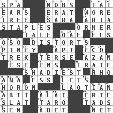 ACROSS 1. Health resort 4. Crowds into 8. Make lace 11. Hearing organs 13. Part of Q.E.F. 14. Had on 15. Family _ (genealogy) 16. "Two Mules for Sister ____" 17. Roberta Peters solo 18. Paper fasteners 21. Channel Islands abalone 22. Story 23. Clumsy lout 25. Raised railways 26. Bear (Spanish) 29. What propaganda does 32. Abounding in pines 34. Fitting 35. Environmental prefix 38. Long journey 39. Laconic 41. Muslim summons to prayer 43. Compass dir. 44. Followers of ems 45. Feeling or showing extreme anger 46. Most questionable 50. 17th letter of the Greek alphabet 51. Santa ___, CA 54. Curvy letter 55. Allows 57. Person of subnormal intelligence 59. Of or relating to Laos or its people 63. "This won't hurt ____!" 64. Jai ____ 67. One of the Great Lakes 68. Narrow board 69. Pacific island yam 70. Bits 71. Elected rep. 72. Collude with 73. Fish or hair follower DOWN 1. Arranges properly for use 2. Role in a play 3. Length times width 4. Makes clutter 5. Mouth or opening 6. Tavern 7. R.R. building 8. Singer Mel 9. Satellite of Uranus 10. Pulls into pieces 12. Back-to-school mo. 14. Armed conflict 19. Kenny Rogers chart-topper in '80 20. Biblical high priest 21. Often (poetically) 23. I made a mistake 24. Johnson of "Laugh-In" 26. Elect 27. Title for a man of rank and authority 28. Washington bills 30. Tarsus (plural) 31. Singe 33. Supplements with great effort 36. Russian ruler of old 37. Pledge 39. Beverages made from leaves 40. Extremities 42. Modern: prefix 45. "Tell ____ the Marines!" 47. Layer 48. American author Paul (1891-1958) 49. Ocean 51. Collect or gather 52. Having high moral qualities 53. Believer in; advocate of (suffix) 56. Proofreading order 58. Baseball player Mel 60. SW Asia republic 61. Helper 62. Egg locale 64. "One Day ___ Time" 65. Experiment locale 66. "We ___ not amused" (Victoria)