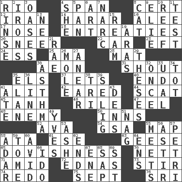 ACROSS 1. River (Sp.) 4. Connect, as a bridge 8. An absolute certainty 12. SW Asia republic 14. Ethiopian city, capital of Harari 16. Toward shelter 17. Characteristic smell of wine 18. Pleas 20. Contemptuous expression 22. 4-wheeled motor vehicle 23. Newt 24. Double-curved letter 25. Nanny (var.) 28. Floor covering 30. A really long time 31. Yell 35. Raised railways 37. Allows 40. Inside; within (prefix) 41. Set down 42. Having ears or earlike features 44. Leave at once 45. Hyperbolic tangent 46. Cause heat under the collar 47. Snakelike fish 48. Foe 50. Lodging establishments 52. Actress Gardner 54. Girls' org. (abbr.) 55. Atlas unit 58. _ moment's notice (2 wds.) 61. Compass dir. 63. Honkers 65. Innocence, gentleness, or tenderness 70. Remaining after all deductions 71. Among 72. Ferber et al. 73. Commotion 74. Redecorate 75. Back-to-school mo. 76. Indian title of respect (Mr.) DOWN 1. Wash lightly 2. Removes the wrinkles 3. Fertile tracts in a desert 4. A female animal or person 5. Baking dish 6. Tate display 7. Drug cop 8. Domesticated feline 9. Writer Wiesel 10. Coral collection 11. Trial 13. Born 15. 480, 500 or 516 sheets of paper 19. Ancient river in northeast Turkey 21. Actress Charlotte 26. Undercover agent 27. Approach 29. College papers 30. Respiratory problem 32. At one time in the past 33. Hereditary estate 34. Small child 35. Enthusiasm 36. Actor's bit 38. Three (prefix) 39. Former Milwaukee Brewers owner Bud 41. Had dinner 43. Hiding places for outlaws 49. Jacques Cousteau's middle name 51. Tired old horse 53. American tennis player Robert 55. Confronts 56. Being in motion 57. _ dish (used to culture cells) 58. The sixth month of the Jewish calendar 59. Heavy book 60. Enthusiastic 62. Extremities 64. Followers of ems 66. Wedding promise 67. Compass dir. 68. Plant excrement 69. Fast jet (abbr.)