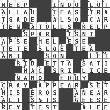 ACROSS 1. Shed a tear 5. Southeast Asian peninsula 9. Car dealer's back yard 12. Assad's deity 14. Beverages made from leaves 15. Retirement account (abbr.) 16. Sadhe (variant) 17. In addition 18. Auto 19. "___ Little Indians" 20. Ringlike coral islands and reefs 23. Seaweed 24. Coast Guard woman 25. Is not 27. Domed church section 30. Cartoonist voice _ Blanc 32. Compass dir. 33. Wig 34. A type of plum 36. Beverage made from leaves 38. Black tropical American cuckoo 39. Male child 40. Allow 43. To free from 46. Singer James 48. Suttee (variant) 49. Apple computer (short form) 51. Indian title of respect (Mr.) 52. Louse (plural) 53. Billionth: prefix 54. Whirlpool 56. Supercomputer manufacturer 58. Become visible 61. Put into a specified state 64. Part of HMS, perhaps 65. Greek god of love 66. Approach 68. The first octave above the treble staff 69. Fast planes 70. Honkers 71. Marina Del _, California 72. Trial 73. Toward shelter DOWN 1. Electrical Unit 2. Otherwise 3. Style 4. Groovy apt. 5. Slanted text style (abbr.) 6. 1994 drama film starring Jodie Foster 7. Hyrax 8. Bear (Spanish) 9. It is permitted: Lat. 10. Relating to the mouth 11. Canvas cover 13. Pile 21. Scottish caps 22. Threatening words 23. Leg joint 24. Perceive with the eye 26. Fast jet (abbr.) 27. _ moment's notice (2 wds.) 28. Animal enclosure 29. Tumult 31. Plunders 35. Main course 37. Jai ____ 41. And so on (abbr.) 42. Standoff 44. "If ____ say so..." 45. One of the 12 tribes of Israel 47. Opera by Verdi 48. Roguish 50. Unrefined 53. Difficult 55. To be drawn or hauled along 56. Burn to charcoal 57. Cause heat under the collar 59. Plant holders 60. Inconspicuous attention getter 61. Sew up the eyelids of hawks and falcons 62. Comfort 63. Relationship diagram 65. Eastern Standard Time (abbr.) 67. Teachers' org.