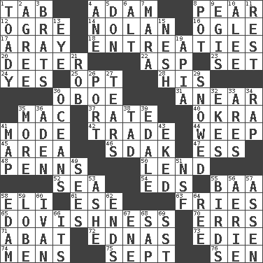 ACROSS 1. Keyboard key 4. First of billions? 8. Lightbulb-shaped fruit 12. Legendary monster 14. Pitcher Ryan 16. Stare at amorously 17. Like ___ of sunshine 18. Pleas 20. Prevent from occurring 22. Viper 23. Arrange properly for use 24. Consenting reply 25. Elect 28. Part of HMS, perhaps 30. Mitch Miller's instrument 31. Approach 35. Apple computer (short form) 37. Assign a rank or rating to 40. Gumbo ingredient 41. Method 42. Exchange 44. Shed a tear 45. Length times width 46. Neighbor of Neb. 47. Curvy letter 48. Actor Sean's family 50. Grant temporary use of 52. Ocean 54. Begley and Asner 55. Sound made by sheep 58. Connecticut Ivy Leaguer 61. Compass dir. 63. Strips of potato fried in deep fat 65. Innocence, gentleness, or tenderness 70. Blunders 71. Blind as ____ 72. Ferber et al. 73. Singer Brickell 74. Not women's 75. Back-to-school mo. 76. Elected rep. DOWN 1. Sycophant 2. Match 3. Naughty children 4. A saturated hydrocarbon 5. Spanish title 6. Keyboard modifier key 7. Hindu Mythology: god of death 8. Plant holder 9. The front part of a cuirass 10. Toward shelter 11. State of inaction 13. Sight organ 15. Tender 19. Capital of Western Samoa 21. Director Reiner 26. Left side of a ship or aircraft 27. Lacerates 29. Overwhelmed 30. Seas 32. Supplements with great effort 33. Ancient Greek god of war 34. Strike 35. Greater amount 36. An important port of Yemen 38. Small amount or degree 39. Peak District village in England 41. Atlas unit 43. Made supply last 49. Perceives with the eye 51. Science/research agcy. 53. American tennis player Robert 55. Avian creatures 56. Nest on high 57. NE Netherlands city 58. Dutch treat 59. Ear part 60. _ the terrible 62. Conclusions 64. To separate or throw off 66. It is 67. Compass dir. 68. Plant excrement 69. Fast jet (abbr.)