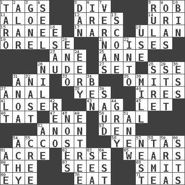 ACROSS 1. Labels 5. HTML Container Element 8. Director Reiner 11. _ vera 12. Ancient Greek god of war 14. RI univ. 15. The wife of a rajah (variant) 17. Drug cop 18. Uhlan (variant) 19. Threatening words 21. Annoying sounds 23. A saturated hydrocarbon 25. Singer Murray 26. Naked 27. Arrange properly for use 28. Compass dir. 31. Black tropical American cuckoo 33. Globe 35. Leaves out 37. Of or related to the anus 38. Affirmative reply 40. Angers 41. Failure 43. Tired old horse 45. Allow 46. Make lace 47. Compass dir. 50. Mountain range 52. Soon (poet.) 53. Lair 54. Buttonhole 56. Gossips 61. Measure of real estate 62. Celtic language 65. Puts on (as clothing) 66. Definite Article 67. Perceives with the eye 68. Stricken, poetically 69. Sight organ 70. Erode 71. Afternoon social gatherings DOWN 1. Edible starchy tuberous root 2. Having or resembling wings 3. Went 4. Sew up the eyelids of hawks and falcons 5. Daniel's nick name 6. Retirement account (abbr.) 7. Actresses Bloom and Felton 8. Court order 9. Mouths or openings 10. Storage container 13. Biscuitlike quick bread 16. He sold his birthright 18. Purpose 20. Inside; within (prefix) 22. To the inside or interior of 24. Suggestive of the supernatural 26. The longest river in the world 28. Beget 29. Proofreading order 30. Double-curved letter 31. Small Philippine buffalo 32. Political cartoonist Thomas 34. Benjamin's nick name 36. Place where flour is made 37. The first octave above the treble staff 39. Saudi Arabian king (1953-1964) 42. Western Nevada city 44. Jennifer or Joel 48. Olfactory organs 49. Main course 51. Afresh 52. Adept person 54. Painful 55. Algonquian 57. Egg locale 58. Not wild 59. Roberta Peters solo 60. Fast planes 61. Had dinner 63. Ocean 64. Eastern Standard Time (abbr.)