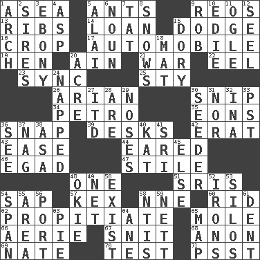 ACROSS 1. At sea 5. Pismires 9. Vintage cars 13. Chest bones 14. Grant temporary use of 15. Evade 16. Riding implement 17. Car 19. Layer 20. The 18th letter of the Arabic alphabet 21. Armed conflict 22. Snakelike fish 23. Synchronize (abbr.) 25. Filthy place 26. Believer in; advocate of (suffix) 30. Clip 34. Stone: prefix 35. Immeasurably long periods of time 36. Fastener 39. Writing tables 42. Part of Q.E.F. 43. Relaxation 44. Having ears or earlike features 46. Mild oath 47. Vertical member of a panel or frame 48. Single 51. Indian titles of respect 54. Plant excrement 57. A weed 58. Compass dir. 60. To free from 62. Appease 65. Undercover agent 66. Nest on high 67. In a ____ (agitated or irritated) 68. Soon (poet.) 69. Nathan's nickname 70. Trial 71. Inconspicuous attention getter DOWN 1. Bowlike part 2. Male parents of animals 3. Dark wood 4. Viper 5. Mountain range southwest of Kyrgyzstan 6. Part of speech 7. Make lace 8. Overwhelms 9. Director Reiner 10. Singer Brickell 11. Stare 12. Sew up the eyelids of hawks and falcons 15. Small, narrow, flatbottom fishing boat 18. Floor protector 20. Land measure 24. Slept 27. It would 28. "We ___ not amused" (Victoria) 29. Olfactory organs 30. Sowing specialist 31. Not either 32. _ tizzy (2 wds.) 33. Pacific Standard Time (abbr.) 36. Perceive with the eye 37. Tired old horse 38. White ___ sheet 40. Krazy ___ of comics 41. _ Lanka 45. Otherwise 48. Migrant worker of the '30s 49. Fish or hair follower 50. Be 52. Metal shackles 53. Grain storage towers 54. Connect, as a bridge 55. Length times width 56. Left side of a ship or aircraft 58. Nuclear Threat Initiatives 59. Remaining after all deductions 61. Gouge 63. Sliced dessert 64. One (Scot) 65. Atlas unit