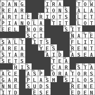 ACROSS 1. Mild oath, euphamism for damn 5. Lyricist Gershwin 8. Pull behind 11. Stern 12. Charged particles 14. Wing 15. Nick name for Arthur 17. Disturbances 18. Allow 19. Player piano 21. Teat (slang) 22. Car dealer's back yard 23. Snakelike fish 24. And not 25. Be seated 27. _-fi 28. Nathan's nickname 31. Table seasoning 35. It is 37. Secret move to avoid paying debts 38. Length times width 39. It is so 41. Monthly bill 42. Play the lead 43. Help 45. At sea 46. Arranges properly for use 47. Afternoon social gathering 49. Part of HMS, perhaps 51. 4-wheeled motor vehicle 52. R.R. building 55. Adept person 57. Cleo's killer 60. Speakers 62. Slender fish 63. Suffix with ecto or cyto 65. Grain storage towers 66. Compass dir. 67. Beer foam 68. French philosopher Descartes 69. It would 70. Compass dir. 71. Genesis locale DOWN 1. Window treatment 2. Nest on high 3. Brizilian seaport 4. Broad smile 5. One more than two 6. Carrot, for example 7. Opposed to 8. Baron Munchausen's specialties 9. Margarine 10. Electrical Unit 13. Fast planes 16. Immeasurably long periods of time 17. Noteworthy scarcity 20. Venues 26. Kind of red light 29. Prong on a fork 30. Singer James 31. Backtalk 32. Johnson of "Laugh-In" 33. Tough but pliablecoriaceous 34. Tarsus (plural) 36. Ocean 40. "Cheers" or "Ellen" 44. Letter starter 48. Ancient river in northeast Turkey 50. Plant excrements 52. Having a sole or soles 53. Marketplace scale 54. NE Netherlands city 55. Hindu god of fire 56. Patter 58. Turn sharply 59. Groovy apts. 61. Hoop that covers a wheel 64. Compass dir.
