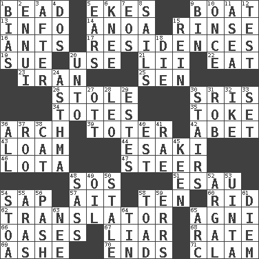 ACROSS 1. Necklace unit 5. Supplements with great effort 9. Water vessel 13. A message received and understood 14. Small Philippine buffalo 15. Wash lightly 16. Pismires 17. Homes 19. Institute legal proceedings 20. Purpose 21. Cards in a Roman deck? 22. Erode 23. SW Asia republic 25. Elected rep. 26. Fur scarf 30. Indian titles of respect 34. Lugs 35. Puff or smoke 36. Bowlike part 39. Carrier 42. Collude with 43. Rich soil 44. 1973 Nobel Price Winner (Physics) Leo 46. Globular water bottle used in Asia 47. Bull 48. Mayday 51. He sold his birthright 54. Plant excrement 57. Small island 58. Nine, plus one 60. To free from 62. Interpreter 65. Hindu god of fire 66. Fertile tracts in a desert 67. One who doesn't tell the truth 68. Assign a rank or rating to 69. American tennis player Robert 70. Extremities 71. Burrowing marine mollusk DOWN 1. Prejudice 2. World-weariness 3. Following 4. Two (Sp.) 5. Hearing organs 6. Leg joint 7. Greek goddess of the dawn 8. Moves on water 9. Storage container 10. Single time 11. Toward the sea 12. Trial 15. It's straight from the horse's mouth 18. Pass on 20. To (old English) 24. Respiratory problem 27. Baseball player Mel 28. Lion 29. _____ Park, CO 30. Flight of steps 31. Director Reiner 32. D.D.E's nickname 33. Arrange properly for use 36. Everything 37. Friend of Pooh 38. Feline 40. Eastern Standard Time (abbr.) 41. Actress Charlotte 45. Peachy ____! 48. Backtalk 49. Petroleum 50. Showing deterioration from age 52. Therefore, facetiously 53. National forest in Provo, Utah 54. Portico 55. Caspian sea tributary 56. Romantic infatuation 58. Frog relative 59. Blunders 61. South Vietnam president (1954) 63. Born 64. Shallow baking pan 65. Curve