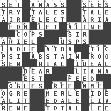 ACROSS 1. Put into a specified state 4. Collect or gather 9. Observes 13. Attempt to accomplish something 14. Falsehoods 15. Lie 16. Wind 17. Choose 18. Roberta Peters solo 19. Period of immesurable duration 21. Allow 22. Place in a line 24. 911 reaches them 26. Title for a knight 27. Satellite of Uranus 29. United States Postal Service (abbr.) 30. Dipping utensil 31. Opera by Verdi 33. Affectionate concern, for short 36. Air pressure measure (abbr.) 37. Refrain by choice 40. Friend of Pooh 41. Elected rep. 42. Monetary unit of Yemen 43. Perfect 45. Letter starter 47. Woody, climbing, usually tropical plant 48. Eastern Standard Time (abbr.) 49. Nourish 50. Stares 52. To riddle 54. Madame (abbr.) 56. Legendary monster 57. Haggard of country music 59. Binary compound 61. Set down 62. Peak District village in England 63. 54 in ancient Rome 64. French philosopher Descartes 65. "_____ Recall" 66. Area sheltered from the wind DOWN 1. R.R. building 2. 4th largest of the Great Lakes 3. Polypeptide antibiotic 4. Had dinner 5. Promenades 6. Toward shelter 7. Religious group 8. Fast jet (abbr.) 9. Flight of steps 10. Merit 11. Writer Wiesel 12. Ocean 20. Christmas carol 22. Slender Brazilian palm 23. Mouth edge 25. Entreaty 27. High mountains 28. To erase 29. Freehold land 31. SW Saudi Arabia district 32. Call ___ day 33. Excercise machine 34. Grant temporary use of 35. Root beer relative 38. Naughty children 39. The longest river in the world 44. South Vietnam president (1954) 45. Erase 46. Compass dir. 49. Man or boy (slang) 50. Stare 51. Broad smile 52. Make new 53. Part of Q.E.F. 55. Singer Brickell 56. Rowing implement 57. Was introduced to 58. Snakelike fish 60. Night before a holiday