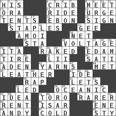 ACROSS 1. Part of HMS, perhaps 4. Baby bed with high sides 8. Confront 12. Mouth or opening 13. Travel on an animal 14. Goad 15. Portable shelters 18. Inky black, to poets 19. Omen 20. Paper fasteners 22. Turn to the right 23. Mine, in Marseilles 24. Fish or hair follower 25. R.R. building 26. Electrical Measurement 30. Call ___ day 33. Swept the length of 36. Dutch treat 37. Hoop that covers a wheel 39. Cards in a Roman deck? 40. Suttee (variant) 41. An important port of Yemen 42. Tall tales 44. Was introduced to 45. Cordwainer's material 47. Binary compound 50. Reproach for some lapse or misdeed 51. Allows 53. Directed 54. Pertaining to the sea 57. The main thing one is thinking about 59. "Corrida" creature 61. More valued for its uncommonness 63. Monthly bill 64. Austrian river, tributary to the Danube 65. Compass dir. 66. Actor Griffith 67. Lacking warmth 68. Filthy place DOWN 1. Being at a high temperature 2. Angers 3. Before Barbara or Clara 4. Algonquian 5. Chest bones 6. Wedding promise 7. Benjamin's nick name 8. French bagpipes 9. One of the Great Lakes 10. Oval reproductive body of a fowl 11. Nine, plus one 16. Scottish caps 17. Specific locale 21. One who doesn't tell the truth 22. Set 24. Lower and raise head in agreement 26. Distinctive style or manner 27. First of billions? 28. Yard entry 29. Give off 30. Slanted text style (abbr.) 31. Periodic rise and fall of the sea level 32. Type of rug 34. Having or resembling wings 35. Apertif with cassis 38. Plea 42. Slangy assent 43. Drop; flow; fall 46. Possessed 48. Letter starter 49. Inactive volcano in Sicily 52. Male parents of animals 53. Grant temporary use of 54. Spoken 55. Drawstring 56. Penny 57. Retirement account (abbr.) 58. Lair 59. Nervous spasm 60. Bear (Spanish) 62. Marina Del _, California