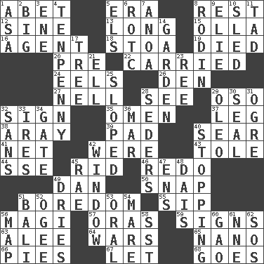 ACROSS 1. Collude with 5. Period 8. State of inaction 12. Trig term 13. Having great length 15. Spanish pot 16. Rep 18. Portico 19. Passed on 20. Before (prefix) 22. Borne 24. Snakelike fish 26. Lair 27. 1994 drama film starring Jodie Foster 28. Perceive with the eye 29. Bear (Spanish) 32. Attach a signature 35. Sign of things to come 37. Part of a journey 38. Like ___ of sunshine 39. Groovy apt. 40. Burn superficially 41. Fish or hair follower 42. We are 43. Lacquered or enameled metalware 44. Compass dir. 45. To free from 46. Redecorate 49. Daniel's nick name 50. Fastener 51. Mood resulting from idleness 55. Small drink 56. Wise men 57. Mouths or openings 59. Omens 63. Toward shelter 64. Armed conflicts 65. Billionth: prefix 66. Sliced desserts 67. Allow 68. Leaves DOWN 1. White ___ sheet 2. Of large size 3. Compass dir. 4. 3-inch nail 5. Raised railways 6. College mil. group 7. Small Philippine buffalo 8. "The Thinker" sculptor 9. Writer Wiesel 10. Downhill vehicle 11. Small amount or degree 14. Place where plants grow 17. Relationship diagram 21. Pipe bend 23. Portuguese money of account (variant) 25. Slanted 28. Spring feasts 29. Butter sub 30. Lick closed 31. Legendary monster 32. Without 33. Angers 34. Yard entry 36. Third mo. 40. Discontinuing 42. Light entry point 45. Actress Charlotte 47. Followers of ems 48. Raised platform 49. Frees from moisture 51. Indonesian resort city 52. Double curve, resembling the letter S 53. Of the mouth 54. Female horse 56. Atlas unit 58. Fast jet (abbr.) 60. E Mali city 61. Compass dir. 62. Mayday