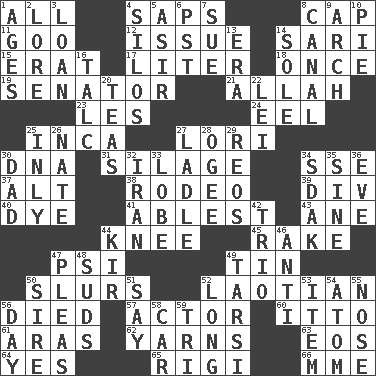 ACROSS 1. 100% 4. Plant excrements 8. Head covering 11. Thick or sticky substance 12. Come out of 14. Indian skirt 15. Part of Q.E.F. 17. 61 cubic inches 18. Single time 19. Legislator 21. Assad's deity 23. French article 24. Snakelike fish 25. South American Indian 27. Australian parrot (variant) 30. Heredity factor (abbr.) 31. Fodder prepared in a silo 34. Compass dir. 37. The first octave above the treble staff 38. Cowboy competition 39. HTML Container Element 40. Color 41. Most capable 43. A saturated hydrocarbon 44. Leg joint 45. Immoral or dissolute person 47. Air pressure measure (abbr.) 49. Metal container 50. Runs notes together 52. Of or relating to Laos or its people 56. Passed on 57. Thespian 60. "Tell ____ the Marines!" 61. Caspian sea tributary 62. Entertaining tales 63. Greek goddess of the dawn 64. Affirmative reply 65. Swiss mountan, "Queen of the Mountains" 66. Madame (abbr.) DOWN 1. Grows older 2. Old wives' tales, e.g. 3. Grant temporary use of 4. Grain storage towers 5. SW Saudi Arabia district 6. Pacific Standard Time (abbr.) 7. Institute legal proceedings 8. Lessep's creation 9. Bowlike part 10. Sliced dessert 13. Period 14. Flatfish 16. Baby powder 20. Beverages made from leaves 22. Flowery wreath 25. Inwardly 26. Nathan's nickname 27. Dipping utensil 28. Double curve, resembling the letter S 29. Vintage cars 30. June honoree 32. SW Asia republic 33. Ear part 34. Neighbor of Neb. 35. Trig term 36. Night before a holiday 42. Musical group of three 44. Apertif with cassis 46. Against 47. Entreaties 48. Soap bubbles 49. Tarsus (plural) 50. Beget 51. Declare 52. Protracted 53. Detail 54. Smallest unit of an element 55. Sense of smell 56. 24 hours 58. Automobile 59. Three (prefix)