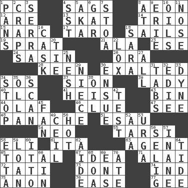 ACROSS 1. Personal Computers (abbr.) 4. Sinks 8. Age 12. "We ___ not amused" (Victoria) 13. Three-handed card game 14. Musical group of three 15. Drug cop 17. Pacific island yam 18. Moves on water 19. Small fatty European fish 21. According to 23. Compass dir. 24. Indian antelope 26. Mouth or opening 28. Peachy ____! 30. Glorified 34. Mayday 37. The Jewish people; Israel 39. Kenny Rogers chart-topper in '80 40. Affectionate concern, for short 41. Robbery 43. Storage container 44. Norwegian king 46. A slight indication 47. Perceive with the eye 48. Flamboyance 51. He sold his birthright 54. Modern: prefix 55. Tarsus (plural) 58. Connecticut Ivy Leaguer 61. Call ___ day 63. Representative 65. Add up to 67. The main thing one is thinking about 71. Jai ____ 72. Jacques of French films 73. Do not 74. Indiana (abbr.) 75. Soon (poet.) 76. Relaxation 77. Turn to the right DOWN 1. Zero-star reviews 2. Dice game 3. Spanish missionary in California 4. Fast jet (abbr.) 5. Alias (abbr.) 6. Slender fish 7. Portico 8. _ moment's notice (2 wds.) 9. One of the Great Lakes 10. Lubricates 11. Characteristic smell of wine 16. Keg 18. "Two Mules for Sister ____" 20. Standoff 22. Brine-cured salmon 25. Tender 27. 100% 29. Sibling's daughter 30. Take place subsequently 31. Bar bills 32. Singer Brickell 33. Unit of force 34. Halt 35. Water jar 36. Glance over 38. Petroleum 42. Trial 45. Air blower 49. To provide with a ceiling 50. Being at a high temperature 52. Auto club (abbr.) 53. Capital and largest city of Mongolia 56. Major League Baseball Commissioner Bud 57. Silly 58. Singer James 59. Grant temporary use of 60. "Tell ____ the Marines!" 62. Helper 64. Periodic rise and fall of the sea level 66. The 18th letter of the Arabic alphabet 68. ___ good deed 69. Followers of ems 70. Had dinner