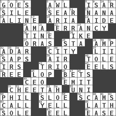 ACROSS 1. Travels 5. Leather borer 8. Austrian river, tributary to the Danube 12. Drop; flow; fall 13. Scorch 15. Nanny 16. Place in a line 18. Roberta Peters solo 19. Helper 20. Housemaid (var.) 22. Tendancy to err 24. Prong on a fork 26. Mamie's mate 27. Mouths or openings 28. R.R. building 29. Electrical Unit 32. The sixth month of the Jewish calendar 35. Municipality 37. Cards in a Roman deck? 38. Plant excrements 39. Atmosphere 40. Lacquered or enameled metalware 41. Big collection agency 42. Musical group of three 43. Snakelike fish 44. To sift 45. Chop off 46. Stakes 49. Corporate head (abbr.) 50. Give off 51. Leopard's kin 55. Single; one (prefix) 56. Silvers or Donahue 57. A type of plum 59. Fraudulent business schemes 63. Give a ring to 64. Shout 65. Thin strip of wood or metal 66. Flatfish 67. Snakelike fish 68. Relaxation DOWN 1. Girls' org. (abbr.) 2. Lubricate 3. Connecticut Ivy Leaguer 4. Legislators 5. White ___ sheet 6. Past tense of be (plural) 7. Den 8. Lacking in sense or substance 9. Ketch in the Levant 10. "60 Minutes" Commentator Rooney 11. Actress Charlotte 14. Noteworthy scarcity 17. Independent ruler or chieftain 21. Santa ___, CA 23. Alias (abbr.) 25. Fortification 28. Disco prop 29. _ vera 30. Place where flour is made 31. Sliced desserts 32. SW Saudi Arabia district 33. Have the gumption 34. Domed church section 36. One more than two 40. A testis 42. Tootsie (variant) 45. Area sheltered from the wind 47. Australian flightless bird 48. Airtight sealed metal containers 49. Cell (Danish) 51. US Secretary of Labor Elaine L. _ 52. Land elevation 53. Toward shelter 54. Opening into or through something 56. Personal Computers (abbr.) 58. Pipe bend 60. Auto club (abbr.) 61. Mountains (abbr.) 62. A female animal or person