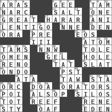 ACROSS 1. Caspian sea tributary 5. Turn to the right 8. Scottish cap 11. Drug cop 12. Table seasoning 14. Single 15. Relatively large 17. Ethiopian city, capital of Harari 18. Cuckoo 19. Small, flat, pigmented spot on the skin 21. Compass dir. 22. Lair 23. Mouth or opening 24. Before (prefix) 25. Greek goddess of the dawn 27. One more than two 28. Smallest unit of an element 31. Scottish caps 35. Compass dir. 37. Lacquered or enameled metalware 38. Sign of things to come 39. Set 41. Hollow 42. Western Nevada city 43. Make lace 45. Narrow board 46. Southwest Nigerian state 47. Pacific Standard Time (abbr.) 49. _ moment's notice (2 wds.) 51. The 23rd letter of the Hebrew alphabet 52. R.R. building 55. The grampus (Milton) 57. ___ good deed 60. Speakers 62. Luau course 63. Columnist Joseph or Stewart 65. Grain storage towers 66. Small child 67. Coral collection 68. French philosopher Descartes 69. Filthy place 70. Clumsy lout 71. Genesis locale DOWN 1. White American of non-Hispanic descent 2. More uncommon 3. Sports stadium 4. Scram! 5. Girls' org. (abbr.) 6. Merit 7. Liveliness 8. Inedible or poisonous agaric 9. Singer Murray 10. Count _ (2 wds.) 13. Family _ (genealogy) 16. Native american tent (variation) 17. Cultivating 20. Amused look 26. Profane or obscene expressions 29. Spanish pot 30. Confront 31. "Corrida" creature 32. So be it 33. Ananias' fault 34. Snout, nose 36. Dripping 40. Portable computer 44. Russian ruler of old 48. It was, poetically 50. The sixth month of the Jewish calendar 52. Having a sole or soles 53. Marketplace scale 54. NE Netherlands city 55. Elects 56. Carrot, for example 58. Butter sub 59. Toward the sea 61. Become fatigued 64. Below a satisfactory level