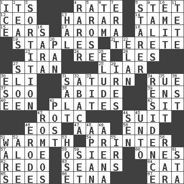 ACROSS 1. It is 4. Assign a rank or rating to 8. Proofreading order 12. Corporate head (abbr.) 13. Ethiopian city, capital of Harari 14. Not wild 15. Hearing organs 17. Odor 18. Came down and settled, as after flight 19. Paper fasteners 21. Cylindrical with tapered ends 23. Lyricist Gershwin 24. Portuguese money of account (variant) 26. French article 27. Comedian Laurel of Laurel & Hardy 28. One who doesn't tell the truth 30. Connecticut Ivy Leaguer 31. Titan orbits this 34. Regret 37. "Barney Miller" actor Jack 38. Remain 39. Followers of ems 40. Car or cant ending 41. Food holders 42. Be seated 43. College mil. group 44. Set of matching outer garments 46. Greek goddess of the dawn 47. Auto club (abbr.) 50. Conclude 51. Heat 54. Hard copy producer 57. _ vera 58. Flexible twig of a willow tree 60. Singles 62. Make new 63. Actors Connery and Penn 64. Feline 65. Perceives with the eye 66. Inactive volcano in Sicily 67. Epoch DOWN 1. Frozen water 2. Afternoon social gatherings 3. Casting lots 4. More valued for its uncommonness 5. Came up 6. Scottish cap 7. Part of Q.E.F. 8. A viewer who gazes fixedly 9. Stories 10. Give off 11. Wig 13. Actor Linden 16. "Two Mules for Sister ____" 20. Baking dish 22. Liveliness 25. Dodge 27. A type of plum 29. Angers 30. Compass dir. 31. Table seasoning 32. Phillipine bananalike plant 33. Teat (slang) 34. Home 35. A single undivided whole 36. Eastern Standard Time (abbr.) 41. Mail 43. Lover boys 44. Elected rep. 45. To (old English) 46. Wear away 48. Bee-related 49. Sports stadium 51. Armed conflicts 52. Toward shelter 53. Stockings 55. Big collection agency 56. Tail end 59. Put into a specified state 61. R.R. building