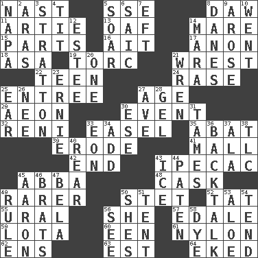 ACROSS 1. Political cartoonist Thomas 5. Compass dir. 8. Obsolete 11. Nick name for Arthur 13. Clumsy lout 14. Female horse 15. Components 16. Small island 17. At once, immediately (arch.) 18. White ___ sheet 19. Torque (variant) 21. Take or capture by force 22. Adolescent 24. Raze (variant) 25. Main course 27. Ripen 29. Age 30. Incident 32. Painter Guido (1575-1642) 33. Artist's stand 35. Blind as ____ 39. Eat (away) 41. Promenade 42. Conclusion 43. Medicinal drug used to evoke vomiting 45. Swedish rock group 48. Keg 49. Less widely known 50. Proofreading order 52. Make lace 55. Mountain range 56. A female animal or person 57. Peak District village in England 59. Globular water bottle used in Asia 60. Car or cant ending 61. High-strength synthetic material 62. Followers of ems 63. Eastern Standard Time (abbr.) 64. Supplemented with great effort DOWN 1. California wine valley 2. Ancient river in northeast Turkey 3. Ski resort town in Vermont 4. Teat (slang) 5. Fly high 6. Ketch in the Levant 7. Newt 8. Natives or inhabitants of Denmark 9. Came up 10. Gone 12. First name in cosmetics 14. Hindu Mythology: god of death 20. Single 21. Songbird 23. Bert's buddy 25. Ewer handle 26. Born 27. "___ Maria" 28. Set 30. Compass dir. 31. Corrects by punishment or discipline 33. A really long time 34. Increase 36. Sass 37. Insect wing 38. Affectionate concern, for short 40. Rump 43. Frozen water 44. Eucharist need 45. Composer Copland 46. Naughty children 47. Actor Lugosi 49. General guideline 50. "______ My Girl" (Turtles hit) 51. Portable shelter 53. Medicinal plant 54. Be inclined (to) 56. Perceive with the eye 58. Color