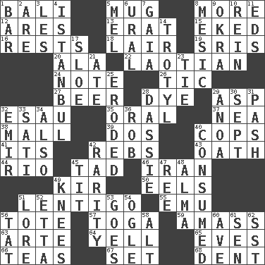 ACROSS 1. Indonesian resort city 5. Java container 8. Greater amount 12. Ancient Greek god of war 13. Part of Q.E.F. 15. Made supply last 16. Musical pauses 18. Den 19. Indian titles of respect 20. Wing 22. Of or relating to Laos or its people 24. Brief written record 26. Nervous spasm 27. Fermented drink made from hops 28. Color 29. Cleo's killer 32. He sold his birthright 35. Taken by mouth 37. Teachers' org. 38. Shopping center 39. Two (Sp.) 40. 911 reaches them 41. ___ a Wonderful Life 42. Confederate soldiers (slang) 43. Pledge 44. River (Sp.) 45. Small boy 46. SW Asia republic 49. Apertif with cassis 50. Snakelike fish 51. Small, flat, pigmented spot on the skin 55. Australian flightless bird 56. Carryall 57. Ancient Roman robe 59. Collect or gather 63. Johnson of "Laugh-In" 64. Shout 65. Nights before holidays 66. Beverages made from leaves 67. Arrange properly for use 68. Gouge DOWN 1. Long, evenly shaped piece 2. "We ___ not amused" (Victoria) 3. French article 4. Byzantium, centuries later 5. Cartoonist voice _ Blanc 6. Mountain range 7. Greek goddess of the earth (variant) 8. Mesonic 9. Gumbo ingredient 10. It's straight from the horse's mouth 11. Begley and Asner 14. TNT 17. _ gin 21. Had dinner 23. Standoff 25. Eaten away 28. Hyrax 29. Small Philippine buffalo 30. Back-to-school mo. 31. Romantic infatuation 32. Arab leader 33. Suttee (variant) 34. In addition 36. Director Reiner 40. Eaten 42. Noteworthy scarcity 45. Teat (slang) 47. To riddle 48. _ mater 49. Leg joints 51. Old wives' tales, e.g. 52. Singer James 53. Leaves 54. Stare at amorously 56. Make lace 58. Keyboard modifier key 60. "___ Maria" 61. Elected rep. 62. Fast jet (abbr.)