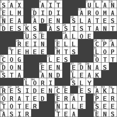 ACROSS 1. Saxophone 4. Small island 7. ____ Bator, Mongolia 11. Shade tree 12. "You Light Up My Life" star Conn 13. Odor 14. Teachers' org. 15. Arabian gulf 16. Chalkboards 17. Writing tables 19. Aide 21. Purpose 23. _ vera 24. It's straight from the horse's mouth 25. Pipe bend 26. Accounting whiz (abbr.) 29. Giggle 30. Mountains (abbr.) 31. Trim (branches) 32. Gear tooth 33. French article 34. Baseball player Mel 35. Spanish title 36. Car or cant ending 37. Ferber et al. 40. R.R. building 41. Added to 42. Path through which fluid escapes 43. Australian parrot (variant) 45. Playfully artful 46. Home 51. 1973 Nobel Price Winner (Physics) Leo 55. Spoke pompously 56. Part of Q.E.F. 58. For each 59. Carrier 60. "Death on the ____" 61. Observe 62. SW Saudi Arabia district 63. Afternoon social gathering 64. Followers of ems DOWN 1. Post 2. Toward shelter 3. Dec. holiday 4. Assist 5. It may be bright or harebrained 6. Canisters 7. A salt of uric acid 8. Globular water bottle used in Asia 9. So be it 10. Political cartoonist Thomas 12. Hyrax 13. In addition 16. Beverly of Met fame 18. Malaysian steamed pastry 20. Table seasonings 22. Compass dir. 24. Canadian anthropologist Darnell 25. Make improvements or corrections to 26. Covering 27. Cooking vessels 28. Fitting 29. A blast of a horn 32. Music discs 33. Soviet premier 1918-24 36. Having ears or earlike features 37. Raised railways 38. Erase 39. Negative votes 43. 61 cubic inches 44. Baltic tributary 46. Roll call or roster of names 47. Greek god of love 48. Suttee (variant) 49. Penny 50. 4th largest of the Great Lakes 52. Domed church section 53. Peachy ____! 54. Angers 57. Chicken ___ king