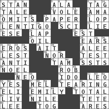 ACROSS 1. Comedian Laurel of Laurel & Hardy 5. In the manner of 8. Label 11. Story 12. Grand slam 14. Nursemaid (var.) 15. Leaves out 17. Some stationery 18. Chop off 19. Small, flat, pigmented spot on the skin 21. _-fi 22. Falsehood 23. Compass dir. 24. Pet locale 25. Eastern Standard Time (abbr.) 27. Lubricate 28. Hearing organs 31. Greek god of love 35. Small island 37. Toward shelter 38. For fear that 39. Or not 41. Trial 42. Opposed to 43. Scottish cap 45. Fast planes 46. Christmas carol 47. Director Reiner 49. Modern: prefix 51. Wedding promise 52. Lion 55. Consenting reply 57. Cartoonist voice _ Blanc 60. Separating forcefully 62. Biblical high priest 63. Poet Dickinson 65. Add up to 66. 54 in ancient Rome 67. The longest river in the world 68. Wig 69. Area sheltered from the wind 70. Coat; cloak 71. Ancient Greek god of war DOWN 1. Took without asking 2. Corrects by punishment or discipline 3. Place in a line 4. Remaining after all deductions 5. Actress Gardner 6. Chops off 7. Actor Baldwin 8. Baron Munchausen's specialties 9. Mine, in Marseilles 10. Yawn 13. One of the Great Lakes 16. Grain storage tower 17. Cotton for raincoats, e.g. 20. Greek goddess of the earth (variant) 26. Theater features 29. Relief 30. Puts into a specified state 31. Enthusiasm 32. Western Nevada city 33. Clearly or manifestly demonstrative 34. Vertical member of a panel or frame 36. Small child 40. Noteworthy scarcity 44. Method 48. Water vessel 50. Sign of something about to happen 52. 61 cubic inches 53. Maternal 54. Stares 55. Shout 56. Writer Wiesel 58. Give off 59. _ and Stitch 61. Roll call or roster of names 64. Part of a journey
