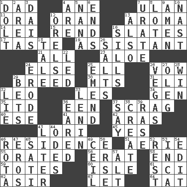 ACROSS 1. June honoree 4. One (Scot) 7. Uhlan (variant) 11. Mouth or opening 12. Northwest Algerian city 13. Scent 14. Luau accessory 15. Tear apart 16. Chalkboards 17. Clothes sense 19. Aide 21. 100% 23. _ vera 24. Otherwise 25. Pipe bend 26. Promise 29. A special lineage 30. Mountains (abbr.) 31. Connecticut Ivy Leaguer 32. Lion 33. French article 34. Commissioned mil. rank 35. It would 36. Car or cant ending 37. Lean end of the neck 40. Compass dir. 41. Added to 42. Caspian sea tributary 43. Australian parrot (variant) 45. Affirmative reply 46. Dwelling 51. Nest on high 55. Declaimed 56. Part of Q.E.F. 58. Conclusion 59. Lugs 60. Capri or Wright 61. _-fi 62. SW Saudi Arabia district 63. Allow 64. Make lace DOWN 1. Dunce 2. Length times width 3. Raised platform 4. "We ___ not amused" (Victoria) 5. Grandmother 6. Extremities 7. A salt of uric acid 8. Globular water bottle used in Asia 9. So be it 10. Political cartoonist Thomas 12. Threatening words 13. In addition 16. Beverly of Met fame 18. Lie 20. Table seasonings 22. Directed 24. Wear away 25. Make improvements or corrections to 26. Viva Las _ 27. Cassini of fashion 28. Victory 29. Stakes 32. Untruth 33. Soviet premier 1918-24 36. Having ears or earlike features 37. Declare 38. Cause to be 39. Raze (variant) 43. 61 cubic inches 44. Lyric poems 46. Roll call or roster of names 47. Greek god of love 48. Suttee (variant) 49. To provide with a ceiling 50. Celtic language 52. Relief 53. South American Indian 54. Prepare for publication 57. Keyboard modifier key