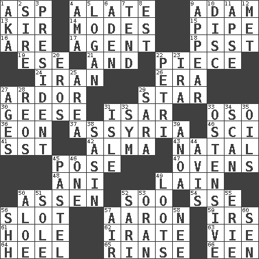 ACROSS 1. Cleo's killer 4. Having winglike extensions 9. First man 13. Apertif with cassis 14. Methods 15. Corncob 16. "We ___ not amused" (Victoria) 17. Rep 18. Inconspicuous attention getter 19. Compass dir. 21. Plus 22. Component 24. SW Asia republic 26. Period 27. Zeal 29. Play the lead 30. Honkers 31. Austrian river, tributary to the Danube 33. Bear (Spanish) 36. Age 37. Nineveh was its capital 40. _-fi 41. Fast jet (abbr.) 42. _ mater 43. Brizilian seaport 45. Airs 47. Baking chambers 48. Black tropical American cuckoo 49. (Had) reclined 50. NE Netherlands city 52. "Barney Miller" actor Jack 54. Compass dir. 56. Slit 57. Composer Copland 59. Big collection agency 61. Hollow 62. Feeling or showing extreme anger 63. Compete 64. Person who is morally reprehensible 65. Wash lightly 66. Car or cant ending DOWN 1. Alias (abbr.) 2. Father 3. Elected leader of a country 4. Nanny (var.) 5. Utah city north of Ogden 6. Arabian gulf 7. Be inclined (to) 8. Eastern Standard Time (abbr.) 9. Become visible 10. Plate 11. Domed church section 12. Was introduced to 20. Greek god of love 22. _ dish (used to culture cells) 23. Retirement account (abbr.) 25. Length times width 27. Eras 28. Vintage cars 29. "Two Mules for Sister ____" 31. Small island 32. Symbol (abbr.) 33. Clearly or manifestly demonstrative 34. Examine hastily 35. Lubricates 38. Indian antelope 39. Small Philippine buffalo 44. Advice 45. Soft color 46. Single 49. Plunders 50. Medicinal plant 51. Not divided or shared with others 52. Indian skirt 53. NW Algerian seaport 55. One of the Great Lakes 56. Quiet! 57. Atmosphere 58. Born 60. Elected rep.