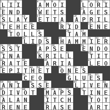 ACROSS 1. Cards in a Roman deck? 4. Mine, in Marseilles 8. Australian parrot (variant) 12. Conclusion 13. Moistens 14. Ripens 15. Kill 17. Singer James 18. Showery time 19. Giggle 21. To free from 23. Compass dir. 24. For Whom the Bell _____ 26. Scottish cap 28. Hats (slang) 30. More overdramatic by comparison 34. Fast jet (abbr.) 37. Domed church section 39. Inside; within (prefix) 40. _ tizzy (2 wds.) 41. Shrimp-like planktonic crustaceans 43. Teat (slang) 44. Pace 46. Operatic vocal solo 47. Lion 48. Curse 51. Washington bills 54. Corporate head (abbr.) 55. Cements 58. Black tropical American cuckoo 61. Compass dir. 63. Make or become more lively 65. A piece of turf (Scot.) 67. Atlas contents 71. Prong on a fork 72. ____ Jay Lerner 73. Hankering 74. Small child 75. French philosopher Descartes 76. To erase 77. Tate display DOWN 1. For fear that 2. An arm off of a larger body of water 3. Potato state 4. Deep reverence 5. Was introduced to 6. Baseball player Mel 7. Austrian river, tributary to the Danube 8. Infant locale 9. Legendary monster 10. It's straight from the horse's mouth 11. Small island 16. Shout 18. First man 20. Connecticut Ivy Leaguer 22. Call ___ day 25. Neighbor of Neb. 27. Madame (abbr.) 29. Small fatty European fish 30. Sun: prefix 31. International (abbr.) 32. Singer Brickell 33. Printing process, for short 34. Title for a man of rank and authority 35. Fastener 36. Jacques of French films 38. Title for a knight 42. Austrian-born American filmmaker Fritz 45. And so on (abbr.) 49. Behest 50. Greek goddess of the dawn 52. Pipe bend 53. Set or collection 56. Webber/Rice musical 57. Sir (Sp.) 58. The sixth month of the Jewish calendar 59. Mediterranean tributary 60. _ the terrible 62. Arab leader 64. Remaining after all deductions 66. Single 68. "One Day ___ Time" 69. Personal Computers (abbr.) 70. A female animal or person