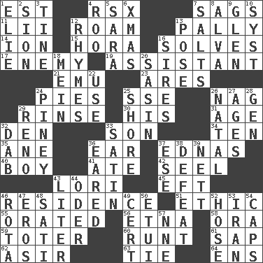 ACROSS 1. Eastern Standard Time (abbr.) 4. Acura sports coupe 7. Sinks 11. Cards in a Roman deck? 12. Wander 13. Friendly 14. Electrically charged atom 15. Israeli folk dance 16. Finds the solution 17. Foe 19. Aide 21. Australian flightless bird 23. Ancient Greek god of war 24. Sliced desserts 25. Compass dir. 26. Tired old horse 29. Remove soap 30. Part of HMS, perhaps 31. Personal question 32. Lair 33. Manchild 34. Nine, plus one 35. One (Scot) 36. Ewer handle 37. Ferber et al. 40. Male child 41. Had dinner 42. Stitch closed the eyes of (a falcon) 43. Australian parrot (variant) 45. Bank Draft (abbr.) 46. Home 51. Value system 55. Spoke pompously 56. Inactive volcano in Sicily 58. Mouth or opening 59. Carrier 60. The smallest animal of a litter 61. Plant excrement 62. SW Saudi Arabia district 63. Make a knot 64. Followers of ems DOWN 1. Writer Wiesel 2. The Jewish people; Israel 3. Prong on a fork 4. Friend of Pooh 5. "Two Mules for Sister ____" 6. Dec. holiday 7. Table seasonings 8. Inventor's middle name 9. Small, secluded valley 10. System (abbr.) 12. Poems 13. Introduce or present, as a question 16. Fathers 18. Chow _ 20. Indian antelope 22. Purpose 24. Abounding in pines 25. Dinah or Pauly 26. Relating to or accompanying birth 27. Matures 28. Commissioned military rank (abbr.) 29. Former U.S. Attorney General Janet 32. Small moist lump or mass 33. Smooth fabric 36. Having ears or earlike features 37. Compass dir. 38. Outscore 39. Remaining after all deductions 43. 61 cubic inches 44. River in Europe 46. Round or rotation of duties 47. Greek god of love 48. Suttee (variant) 49. Foregone conclusion 50. Needle holder 52. Stockings 53. SW Asia republic 54. Balmoral and tarboosh 57. Compass dir.