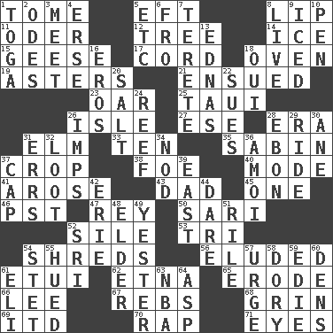 ACROSS 1. Heavy book 5. Newt 8. Mouth edge 11. River in Europe 12. Family _ (genealogy) 14. Frozen water 15. Honkers 17. Drawstring 18. Baking chamber 19. Michaelmas daisies 21. Followed as a consequence or result 23. Rowing implement 25. "Change" in Tahitian 26. Capri or Wright 27. Compass dir. 28. Period 31. Shade tree 33. Nine, plus one 35. Unit of acoustic absorption 37. Riding implement 38. Enemy 40. Method 41. Came up 43. June honoree 45. Single 46. Pacific Standard Time (abbr.) 47. Marina Del _, California 50. Indian skirt 52. Drop; flow; fall 53. Three (prefix) 54. Fragments 56. Evaded 61. Needle holder 62. Inactive volcano in Sicily 65. Wear away 66. Area sheltered from the wind 67. Confederate soldiers (slang) 68. Broad smile 69. It would 70. Strike 71. Snake ____ (dice throw) DOWN 1. Ancient Roman robe 2. Lyric poems 3. Rendezvous 4. Celtic language 5. And so on (abbr.) 6. Back 7. Cylindrical with tapered ends 8. Moving, as bait 9. On the rocks 10. Fenced enclosure 13. Ferber et al. 16. Greek god of love 18. Fr. "Yes" 20. Table seasoning 22. Institutes legal proceedings 24. Coral collection 26. Naughty children 28. Inky black, to poets 29. Travel on an animal 30. A saturated hydrocarbon 31. Blunders 32. Plunder 34. Lower and raise head in agreement 36. Mine, in Marseilles 37. Head covering 39. Compass direction 42. 4th largest of the Great Lakes 44. Have the gumption 48. A person who is older than you are 49. Last past 51. Cause heat under the collar 52. Indian title of respect (Mr.) 54. Proofreading order 55. Became colored 57. Goad 58. Small, narrow, flatbottom fishing boat 59. Singer Brickell 60. Hiding places for outlaws 61. Connecticut Ivy Leaguer 63. Basketball assoc. 64. Cleo's killer