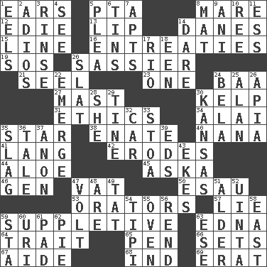 ACROSS 1. Hearing organs 5. Parent Teacher Association (abbr.) 8. Female horse 12. Singer Brickell 13. Mouth edge 14. Natives or inhabitants of Denmark 15. Actor's bit 16. Pleas 19. Mayday 20. More lively and spirited 21. Sew up the eyelids of hawks and falcons 23. Single 24. Sound made by sheep 27. Vertical spar for supporting sails 30. Seaweed 31. Moral principles 34. Jai ____ 35. Play the lead 38. Related on the mother's side 40. Nanny 41. Long (Scottish) 42. Eats (away) 44. Medicinal plant 45. "____ silly question..." 46. Commissioned military rank (abbr.) 47. Large container 50. He sold his birthright 53. Speakers 57. Whopper 59. Supplementary 63. Pulitzer Prize-winning author Ferber 64. Distinguishing feature 65. Writing instrument 66. Arranges properly for use 67. Helper 68. Working for oneself (abbr.) 69. Part of Q.E.F. DOWN 1. Snakelike fish 2. Goodbye (Sp.) 3. Remove soap 4. Perceive with the eye 5. Entreaty 6. Canisters 7. Tenement units (abbr.) 8. Floor protector 9. Cuckoo 10. To separate or throw off 11. Double-curved letter 14. Have the gumption 17. River (Sp.) 18. Car or cant ending 20. Narrow board 22. Develop 24. Actor Lugosi 25. ____ Jay Lerner 26. Capital of Western Samoa 28. A female animal or person 29. Prong on a fork 30. Sunflower state 32. 4-wheeled motor vehicle 33. Portico 35. Volcanic refuse 36. Story 37. Soon (poet.) 39. Begley and Asner 43. Supplements with great effort 47. Electrical Unit 48. "We ___ not amused" (Victoria) 49. Make lace 51. Tree or shrub in the Birch family 52. National forest in Provo, Utah 54. Native american tent (variation) 55. Baking chamber 56. Tear apart 58. 90 degrees 59. R.R. building 60. RI univ. 61. Writing tablet 62. Sliced dessert 63. Compass dir.