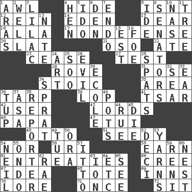 ACROSS 1. Leather borer 4. Flintstone garb 8. Is not 12. It's straight from the horse's mouth 14. Locale of original sin 15. Letter starter 16. Silent film actress Nazimova 17. Unrelated to defense, as in spending 20. Narrow board 21. Bear (Spanish) 22. Had dinner 23. Desist 27. Trial 29. Be footloose 31. Introduce or present, as a question 34. Unemotional 35. Length times width 36. Canvas cover 39. Trim (branches) 41. Russian ruler of old 42. One who uses or employs something 43. Domineers 46. Dad 47. Needle holder 48. Von Bismarck 51. Sleazy 54. Not either 56. RI univ. 58. Merit 61. Pleas 66. Algonquian 67. The main thing one is thinking about 68. Carry 69. Taverns 70. Old wives' tales, e.g. 71. Single time 72. Be seated DOWN 1. Caspian sea tributary 2. Water source 3. Pale purple color 4. Layer 5. Wedding promise 6. Lair 7. Inside; within (prefix) 8. Binary compound 9. Legislators 10. Political cartoonist Thomas 11. Family _ (genealogy) 13. Nathan's nickname 18. Eastern Standard Time (abbr.) 19. Enemy 24. Nonscientific branch of learning 25. "Barney Miller" actor Jack 26. Tending to cause great harm 28. Arguments over trivial matters 30. Learning spot: Fr. 32. Ocean 33. Ewer handle 34. Small fatty European fish 36. Uncastrated adult male sheep 37. White ___ sheet 38. News announcer 40. Cooking vessels 44. Regret 45. Pass on 49. Third day of the wk. 50. Mouth or opening 52. Tenth: prefix 53. Tall tales 54. Famous astronaut Armstrong 55. Southwest Nigerian state 57. "Tell ____ the Marines!" 59. Painter Guido (1575-1642) 60. A home for chicks 62. Actress Charlotte 63. Electrically charged atom 64. And so on (abbr.) 65. Perceive with the eye