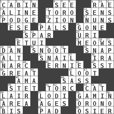 ACROSS 1. Small house or cottage 6. Observe 9. Actress Charlotte 12. Place in a line 13. "Corrida" creature 14. Elected reps. 15. Porridge 16. The Jewish people; Israel 17. Religious women 18. Compass dir. 19. Friends 20. Went 21. Coast Guard woman 23. RI univ. 24. Needle case 25. Catcalls? 28. Daniel's nick name 30. Snout, nose 34. Fastener 35. Keyboard modifier key 36. Slow-paced one 38. Lyricist Gershwin 39. Drug cop 41. Bert's buddy 43. Fast jet (abbr.) 44. Relatively large 46. Spoils 48. Nursemaid (var.) 49. Backtalk 50. Proofreading order 51. Torque (variant) 53. Domesticated feline 56. Den 57. Farming town in central California 58. Street urchin 60. Type of rug 61. Eras 62. U. of Maine site 63. Altar cloth linen 64. Groovy apt. 65. Flexible twig of a willow tree DOWN 1. Head covering 2. Medicinal plant 3. Auction offers 4. Eat 5. Born 6. Earth 7. Greek god of love 8. Age 9. One who advocates reunion 10. Queen of England 1702-14 11. Curvy letter 13. Czar 14. Sounds asleep 19. Aches 20. Chewing product 22. Suppuration 24. Pleas 26. Armed conflicts 27. Petty quarrel 28. Mild oath, euphamism for damn 29. Having or resembling wings 31. Single 32. Rowing implement 33. Metal container 37. Pale purple color 40. Device for capturing images 42. Greek goddess of the dawn 45. Make lace 47. Motion picture awards 49. Indian titles of respect 50. Indian skirt 51. Ancient Roman robe 52. Wrote a lyric poem 54. Mine, in Marseilles 55. Prong on a fork 56. Experiment locale 57. Pet locale 58. Thick or sticky substance 59. Or not