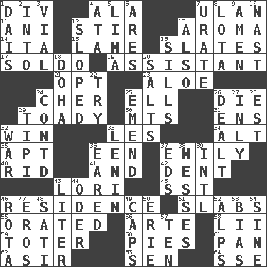 ACROSS 1. HTML Container Element 4. Wing 7. ____ Bator 11. Black tropical American cuckoo 12. Use a spoon 13. Odor 14. Call ___ day 15. Unable to walk 16. Chalkboards 17. Twentieth part of a lira 19. Aide 21. Choose 23. Medicinal plant 24. "Mermaids" star 25. Pipe bend 26. Expire 29. Sycophant 30. Mountains (abbr.) 31. Followers of ems 32. Acquire through effort 33. French article 34. Keyboard modifier key 35. Fitting 36. Car or cant ending 37. Poet Dickinson 40. To free from 41. Added to 42. Gouge 43. Australian parrot (variant) 45. Fast jet (abbr.) 46. Home 51. Broad, flat, thick pieces 55. Declaimed 56. Johnson of "Laugh-In" 58. Cards in a Roman deck? 59. Carrier 60. Sliced desserts 61. Baking dish 62. SW Saudi Arabia district 63. Elected rep. 64. Compass dir. DOWN 1. Raised platform 2. To the inside or interior of 3. Small bottle 4. "One Day ___ Time" 5. Pale green bean 6. Ancient Greek god of war 7. A salt of uric acid 8. Globular water bottle used in Asia 9. So be it 10. Political cartoonist Thomas 12. Had an oblique or slanted direction 13. In addition 16. Beverly of Met fame 18. Capital of the state of Qatar 20. Table seasonings 22. Attempt 24. Continued (abbr.) 25. Make improvements or corrections to 26. Started a card game 27. Inwardly 28. Eastern Standard Time (abbr.) 29. Native american tent (variation) 32. Armed conflict 33. Soviet premier 1918-24 36. Having ears or earlike features 37. Begley and Asner 38. Makes clutter 39. International (abbr.) 43. 61 cubic inches 44. River in Europe 46. Round or rotation of duties 47. Greek god of love 48. Suttee (variant) 49. Balmoral and tarboosh 50. 4th largest of the Great Lakes 52. High mountains 53. Prejudice 54. Trig term 57. "___ Little Indians"