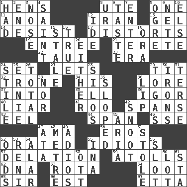 ACROSS 1. Coop moms 5. Shoshoni 8. Single 11. Small Philippine buffalo 12. SW Asia republic 13. Set 14. Cease 17. What propaganda does 19. Main course 21. Cylindrical with tapered ends 22. "Change" in Tahitian 23. Period 24. Put into a specified state 27. Allows 29. Teat (slang) 32. Marketplace scale 34. Part of HMS, perhaps 36. Old wives' tales, e.g. 37. To the inside or interior of 38. Pipe bend 39. Russian composer Stravinsky 40. One who doesn't tell the truth 41. Friend of Pooh 42. Connects, as a bridge 43. Snakelike fish 44. Connect, as a bridge 46. Compass dir. 47. Housemaid (var.) 50. Greek god of love 52. Declaimed 55. Foolish or stupid persons 57. Accusation by an informer 59. Ringlike coral islands and reefs 62. Heredity factor (abbr.) 63. Roll call or roster of names 64. Spoils 65. Title for a knight 66. Eastern Standard Time (abbr.) 67. Singer James DOWN 1. Possessed 2. Compass dir. 3. Olfactory organ 4. Virtuous person 5. RI univ. 6. Clothes sense 7. Keyboard key 8. Legendary monster 9. Remaining after all deductions 10. Otherwise 12. Binary compound 15. Showing deterioration from age 16. Loyal 18. Mouth or opening 20. One or the other of two 24. Vertical member of a panel or frame 25. Bert's buddy 26. Add up to 28. Grain storage towers 29. Ancient Roman robes 30. Metal shackles 31. Laconic 33. Not either 35. Inclined 36. Mouth edge 42. Snout, nose 45. Operatic vocal solo 47. _ moment's notice (2 wds.) 48. Distance measurement (Brit.) 49. Goodbye (Sp.) 51. Took without asking 52. Likelihood 53. Painter Guido (1575-1642) 54. Having or resembling wings 55. _ tizzy (2 wds.) 56. Narrow opening 58. Baseball player Mel 60. Car dealer's back yard 61. R.R. building