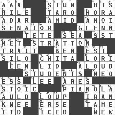 ACROSS 1. Auto club (abbr.) 4. Astound 8. Part of HMS, perhaps 11. Cause heat under the collar 13. Edible starchy tuberous root 14. Israeli folk dance 15. The sixth month of the Jewish calendar 16. Among 17. Mine, in Marseilles 18. Legislator 21. American astronaut and politician John 22. Wig 23. Ocean 25. Fast jet (abbr.) 26. Was introduced to 29. Ski resort town in Vermont 32. Distinguishing feature 34. Benjamin's nick name 35. Eastern Standard Time (abbr.) 38. Grain storage tower 39. Riviera of "Kiss of the Spider Woman" 41. Australian parrot (variant) 43. Car or cant ending 44. Hat (slang) 45. Verbally 46. SAT takers 50. Modern: prefix 51. Curvy letter 54. Area sheltered from the wind 55. Ancient Greek god of war 57. Unemotional 59. Player piano 63. Old (Scot.) 64. Central Nebraska county 67. SW Asia republic 68. Leg joint 69. Celtic language 70. Not wild 71. It would 72. On the rocks 73. ___ Haven, CT DOWN 1. Ancient river in northeast Turkey 2. Helper 3. Actor Alda or Thicke 4. A viewer who gazes fixedly 5. Scottish cap 6. RI univ. 7. Dreamland 8. Residences 9. Metal shackles 10. Inhabitant of Heaven 12. Part of Q.E.F. 14. Actor Linden 19. Trial 20. Baseball player Mel 21. E Mali city 23. Proofreading order 24. Inactive volcano in Sicily 26. Mountains (abbr.) 27. 4th largest of the Great Lakes 28. Story 30. Tolerate 31. 1994 drama film starring Jodie Foster 33. Charged atoms 36. Within a short period 37. Loyal 39. A slight indication 40. Flintstone garb 42. Wedding promise 45. Toward the sea 47. Affectionate concern, for short 48. Slept 49. Three (prefix) 51. 1973 Nobel Price Winner (Physics) Leo 52. Difficult or unusual or dangerous feat 53. Having a sole or soles 56. In a ____ (agitated or irritated) 58. Binary compound 60. Northwest Algerian city 61. Unable to walk 62. Afresh 64. Luau accessory 65. The grampus (Milton) 66. Purpose