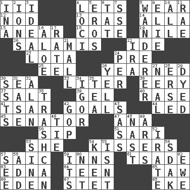 ACROSS 1. One more than two 4. Allows 8. Put on (as clothing) 12. Allow head to fall sleepily 13. Mouths or openings 14. Silent film actress Nazimova 15. Approach 18. ____ d'Azur (French Riviera) 19. The longest river in the world 20. Deli grouping 22. Binary compound 23. Globular water bottle used in Asia 24. Before (prefix) 25. Snakelike fish 26. Felt deep pity or tenderness 30. Ocean 33. 61 cubic inches 36. Suggestive of the supernatural 37. Table seasoning 39. Set 40. Raze (variant) 41. Russian ruler of old 42. Scores awarded for successful feats 44. Directed 45. Elected representative 47. Santa ___, CA 50. Small drink 51. Indian skirt 53. A female animal or person 54. Smoochers 57. Ketch in the Levant 59. Restaurants 61. Sadhe (variant) 63. Pulitzer Prize-winning author Ferber 64. Adolescent 65. The 23rd letter of the Hebrew alphabet 66. Genesis locale 67. Proofreading order 68. Supplement with great effort DOWN 1. _ tizzy (2 wds.) 2. Charged particles 3. Standard of perfection 4. Locales 5. Greek god of love 6. Make lace 7. Compass dir. 8. Nomad 9. Writer Wiesel 10. 100% 11. Actress Charlotte 16. Medicinal plant 17. Pace 21. Promenade 22. Retirement account (abbr.) 24. For each 26. Shout 27. Be tempered by heat 28. Celtic language 29. Colored 30. Fast planes 31. Relaxation 32. ____ Jay Lerner 34. Russian composer Stravinsky 35. Beverage made from leaves 38. File 13 42. Republican Party 43. Backtalk 46. Make a knot 48. Political cartoonist Thomas 49. Ancient Greek god of war 52. Feeling or showing extreme anger 53. Trig term 54. Leg joint 55. Is not 56. Neighbor of Neb. 57. Perceive with the eye 58. Find the sum of 59. It is 60. Fish or hair follower 62. She-sheep