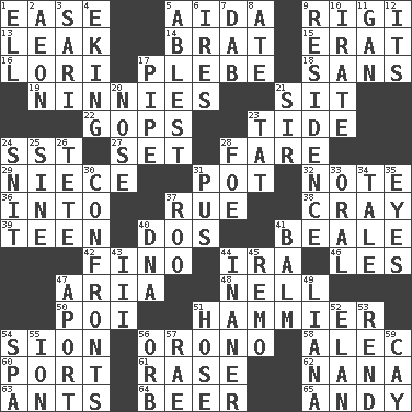 ACROSS 1. Relaxation 5. Opera by Verdi 9. Swiss mountan, "Queen of the Mountains" 13. Path through which fluid escapes 14. Naughty child 15. Part of Q.E.F. 16. Australian parrot (variant) 17. Military trainee 18. Without 19. Fools 21. Be seated 22. Republicans 23. Event that recurs at intervals 24. Fast jet (abbr.) 27. Arrange properly for use 28. Conductor's collection 29. Sibling's daughter 31. Cooking vessel 32. Make mention of 36. To the inside or interior of 37. Regret 38. Supercomputer manufacturer 39. Adolescent 40. Two (Sp.) 41. Calif. Air Force Base 42. A pale, very dry sherry 44. Retirement account (abbr.) 46. French article 47. Operatic vocal solo 48. 1994 drama film starring Jodie Foster 50. Luau course 51. More given to overacting 54. The Jewish people; Israel 56. U. of Maine site 58. Actor Baldwin 60. Left side of a ship or aircraft 61. To erase 62. Grandmother 63. Pismires 64. Fermented drink made from hops 65. Actor Griffith DOWN 1. Pipe bend 2. Period of immesurable duration 3. Indian skirt 4. Supplementing with great effort 5. Most capable 6. Angers 7. Pat or tap gently 8. Had dinner 9. Home 10. Feeling or showing extreme anger 11. Separate the seeds from cotton 12. It is 17. Corncob 20. Sense of smell 21. Title for a knight 23. Make lace 24. In a ____ (agitated or irritated) 25. Trig term 26. False hair 28. Enemy 30. Meets 31. Purulenc 33. Of the mouth 34. Lie 35. Snake ____ (dice throw) 37. Friend of Pooh 40. Heredity factor (abbr.) 41. Lip ointment 43. One more than two 44. Sillier 45. San ____ (Riviera town) 47. To the left, to Queeg 49. Woody, climbing, usually tropical plant 51. Stockings 52. Flair 53. Tear apart 54. Health resort 55. Electrically charged atom 56. Globe 57. Actress Charlotte 59. Island